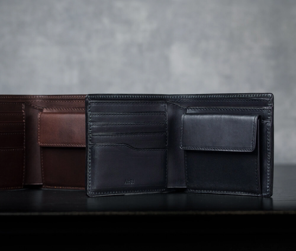 この二つ折り財布はまさに王道の形をしている。左側にはカード段が4段あり、右側には小銭入れがある。札入れは2部屋用意されており、領収書とお札を分けて収納できる。一見、代わり映えのない二つ折り財布という形だが、Alt81だからこその話も多い。ここからはその王道の系譜を辿りつつ、Alt81の世界観に浸っていただこう。