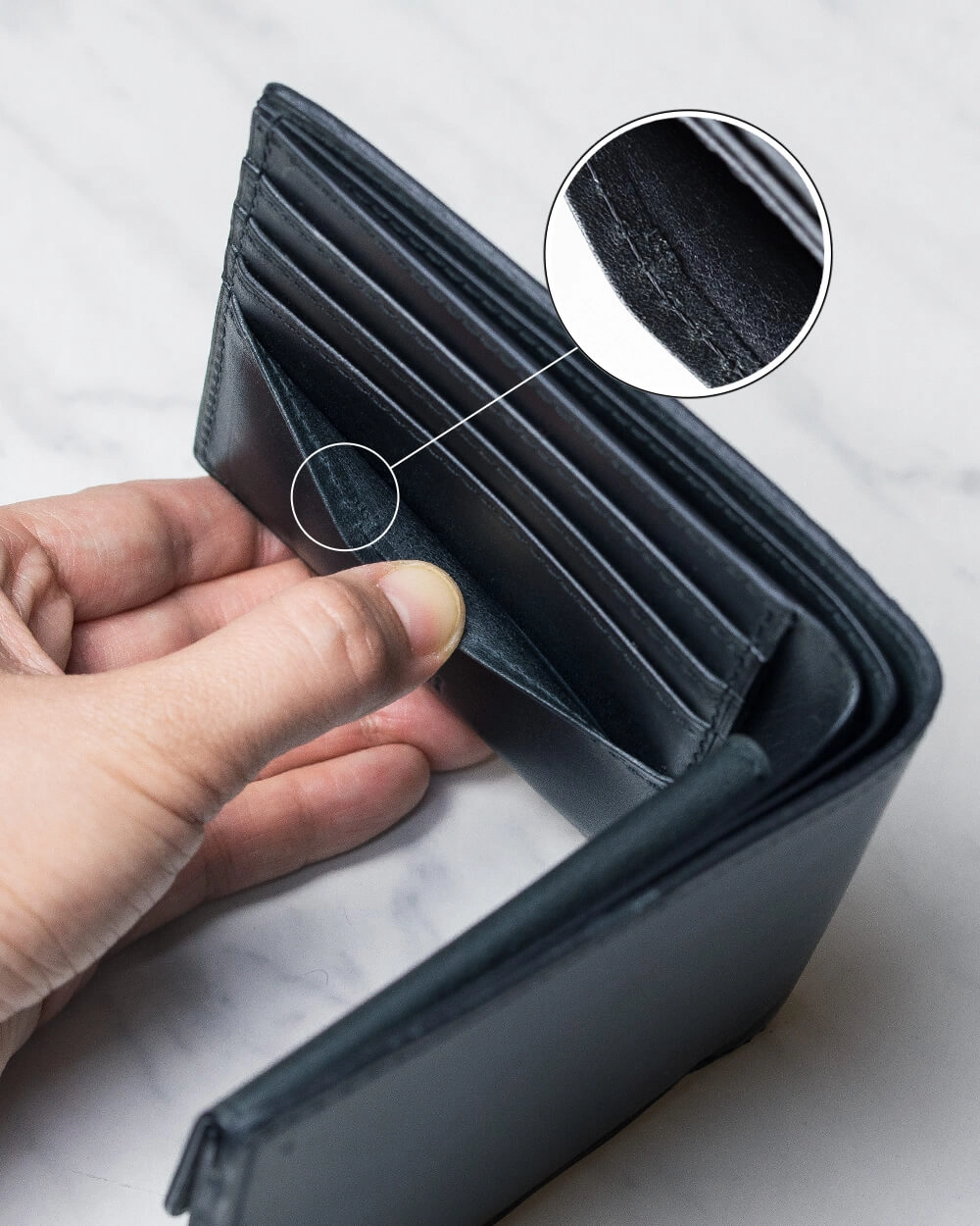 財布を閉じている時、開いている時、いずれもすっきりとシャープな印象になるのは縁に引かれたネン(縁に施されたライン)が理由だ。同じ力且つ同じスピードで引く技術が求められるのだが、革に重なりのある箇所や凹凸のある革などは至極引きにくい。また、よく見るとこの二つ折り財布には内装のいたるところにこのネンが引かれており、非常に手間がかかっていることがわかる。そのおかげで全体がカチッとした印象で統一されていて紳士らしさを演出してくれているのだから、その意味は大きい。