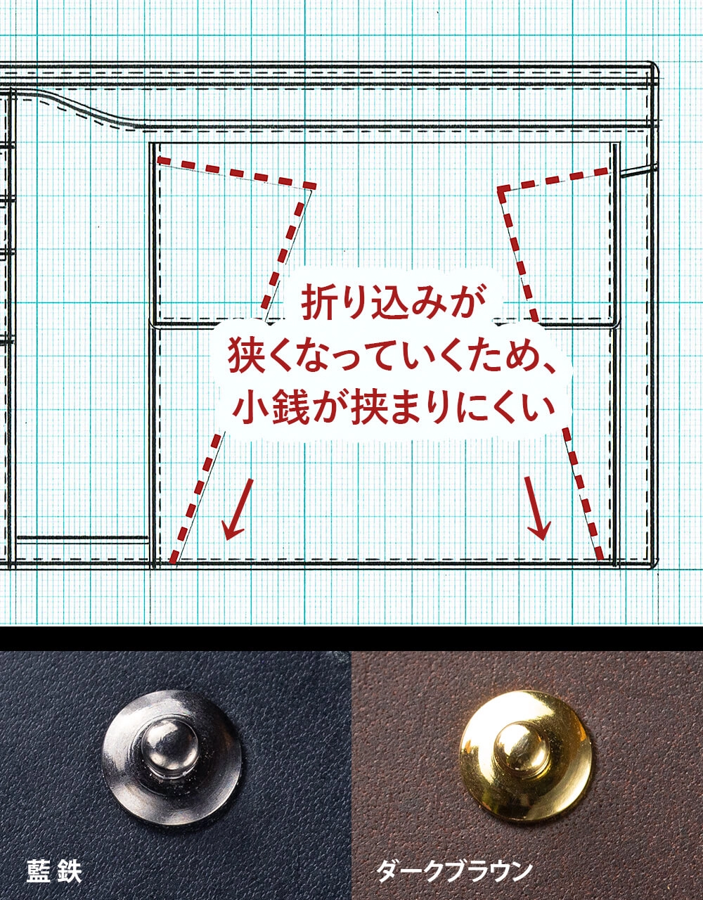 二つ折り財布の小銭入れは折り込まれたササマチの下部に小銭が挟まりやすい。それを軽減させるためにこの小銭入れのササマチの下部の折り込みは斜めになっている。見えにくい箇所だが少しでも取りやすくしたいという気持ちが作りに現れている。また、小銭入れのホックはバネの付いたメス側はドイツのプリム社製(旧イタリアのフィオッキ社製)を、オス側の金具は日本で作成した真鍮削り出しの挽物を採用。留める際に響く「パチッ」という乾いた高音は真鍮削り出し特有のもので、高級感を醸し出してくれる。