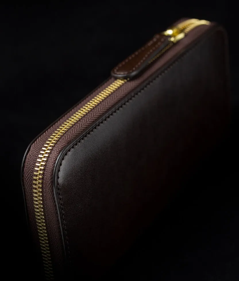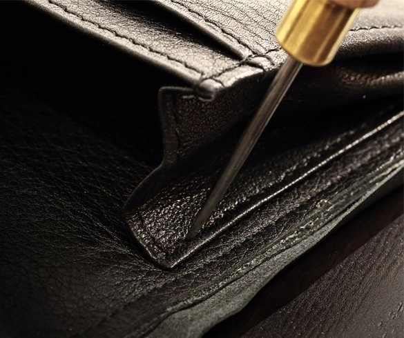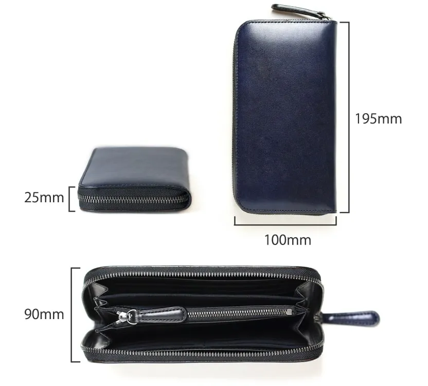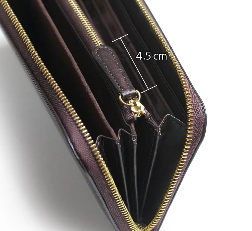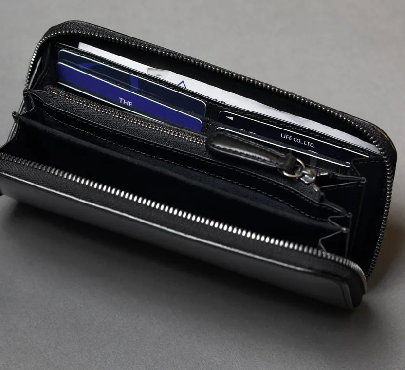 ファスナーは力のかかりやすい曲線部分のカーブを緩くし、壊れにくさを追求。ファスナーテープの縫い方にも細心の注意を払い、たわみのないカーブ、歪みのないストレートラインに仕上げた。またファスナーは通常より大きなのものを使用。一般的なラウンド長財布に使用されているファスナーよりも耐久性はあるがやや滑りが硬くなるという難点を、務歯(ファスナーの噛み合わせる部分)を磨きあげた高級なエクセラファスナーにすることで解決し、滑りをよくしている。