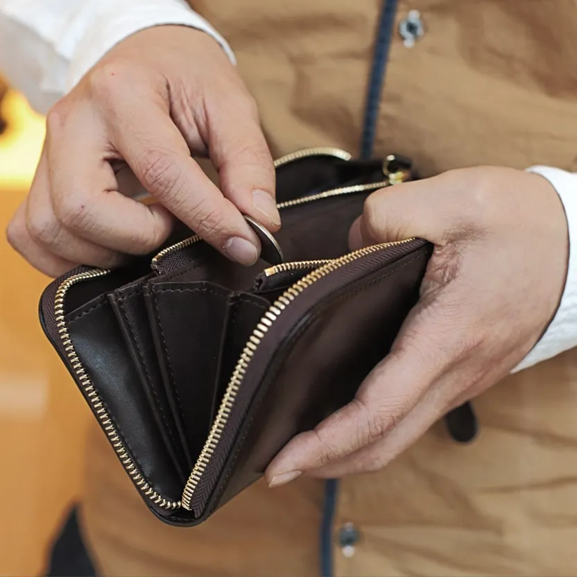 小銭入れの引き手は少し大きめのものを採用している。実は小銭入れの引き手が小さいと外ファスナーを閉めている時に中で動いてしまう。これが外ファスナーを開ける際に変にひっかかり、破損に繋がりやすい。そのため通常よりあえて大きめに設計。閉める際に内側に仕舞うクセを付ける必要はあるが、小さな引き手と比べると使いやすさと壊れにくさは明らかに違う。また2か所の引き手は両方とも断面が美しく映えるよう丁寧なコバ処理を施している。