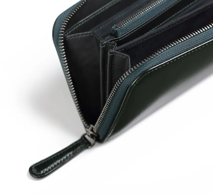 硬くパンッとした張りのあるこの革は使用する面の大きな長財布でこそ、その魅力が最大限発揮される。その名も「ルガトショルダー」。表面に光沢を宿し、その奥にショルダー特有の模様が美しく映える。力強さが滲むグリーンに、上品さを漂わせるダークブラウン、色気を感じさせるネイビー。光の入射角度によって色味や表情が変わるこの革は「革の宝石」と呼ぶに相応しい。