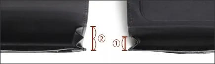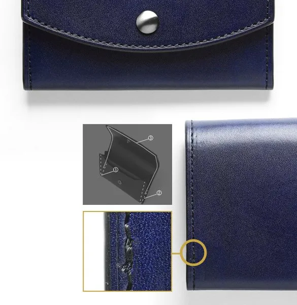 縫製というのはなかなかに奥が深く、それゆえ縫製を見るとその商品の良さが見えてくる。例えば名刺入れをグルっと1周半囲むミシン掛け。背面を見ると下の方にミシン目を揃えて縫製している箇所があるが、これが名刺入れの前段と中のマチを一緒に縫う出発点となる。縫製方法はこうだ。まず、左右合わせて2回、前段に向かってミシンを掛ける。次に片側の出発点と同じミシン穴から最初は逆方向に縫製し、そのままカブセの曲線を経由して逆側の出発点まで一気に縫う。1回の縫製に見えて、実に3回もミシンを掛けているのだ。そして仕上げにはステッチが二重に掛かる箇所に一度掛けた針穴を狙って上から縫製を施していることも見逃せない。最後の最後、職人の気配りが見え隠れしているはずだ。