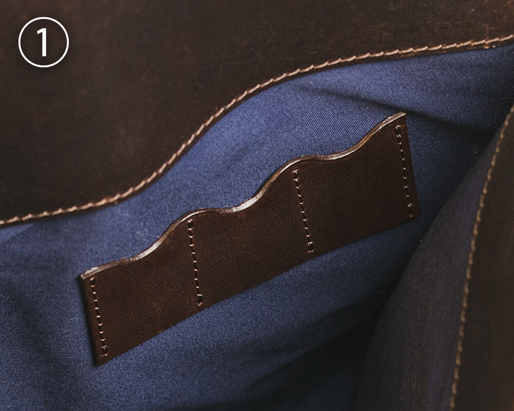 このブリーフケースにはファスナー開閉式の収納部の前後に2つのアオリポケットが備わっている。これが実に機能的だ。留め具には隠しマグネット(革でマグネットを覆う)方式を採用しているため、スッキリとした見た目で、物を出し入れする際に留め具がひっかかることもない。また、ファスナーを開けることなく出し入れができるので、新聞や雑誌、定期など出し入れの頻度が高いものを入れておくと非常に便利。さらに背胴側のアオリポケット内部にはペン挿し(①)とフリーポケット(②)も搭載。このアオリポケットを使えば、外ではほとんど鞄を開けることなく、恐ろしくスムーズに物の出し入れができるはずだ。