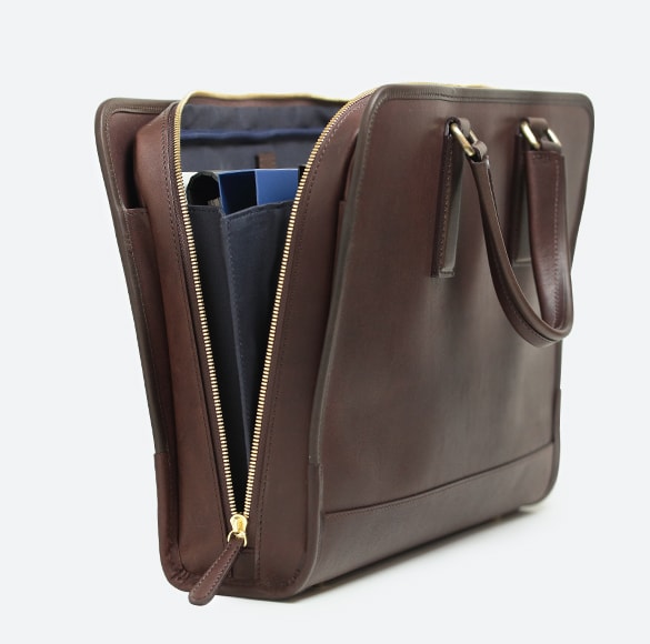 track_ブリーフケース01のファスナーは底面まで全開にすることができるので鞄の中を探しやすい。内装の色は長く使っていると気になる汚れを目立たなくさせるため、ダークブラウンには紺を、藍鉄には茶を採用。またファスナーを全開にしても、蛇腹状のササマチに高さがあるために中のものが側面から見えることがない。さらにファスナーを開けていても鞄が自立してくれる作りも容量がある鞄として使い勝手の良さを実感できる部分だろう。