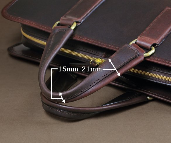 ハンドルは形と同時に荷物の重みに耐えられる強度と耐久性も求められる。Alt81はハンドルと接続する金具の角カン部分に強度が増すよう内側と外側の両方からステッチを施した。作業の手間は増えるが重みの負荷がかかりやすい箇所だからこそあらかじめ入れた工夫である。また、ハンドルには伸び止めを入れ革の伸びを防ぎ、さらに根革(ハンドルを鞄の本体に取り付ける革部分)にも伸び止めを入れるひと手間を加え補強している。手で握るたびに感じる快適な使用感は取引先へ向かう背中を後押ししてくれるだろう。