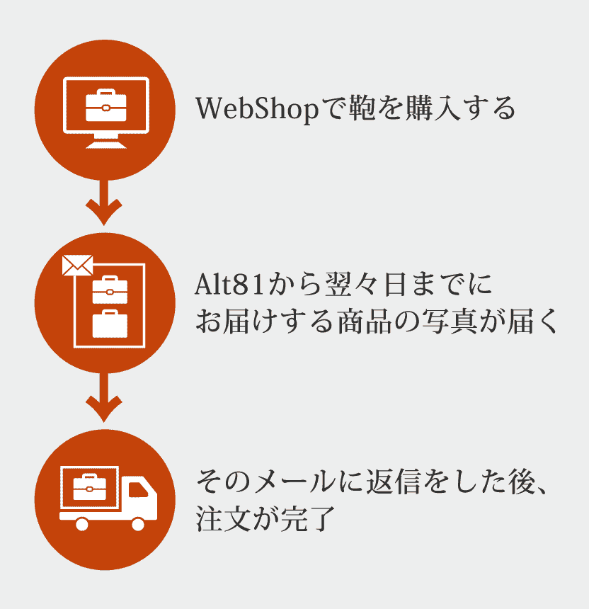 鞄は使用している革の面積が大きいため、シボやトラ模様、擦り傷や色ムラなど様々な表情が入ります。そのため、WebShopで鞄をお買い求めいただいたお客様には注文の翌々日までにご注文時に登録いただいたメールアドレスにお届けする商品の写真をお送りいたします。こちらを必ずご確認いただき、ご了承いただいた旨の返信をお願いいたします。また、鞄は生産数が限られているため表情選択サービスは行っておりません。あらかじめご了承ください。