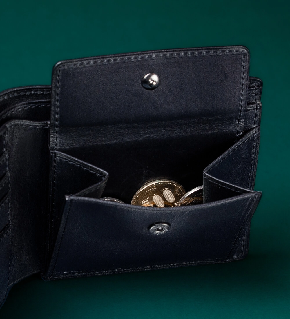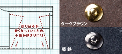 二つ折り財布の小銭入れは折り込まれたササマチの下部に小銭が挟まりやすい。それを軽減させるためにこの小銭入れのササマチの下部の折り込みは斜めになっている。見えにくい箇所だが少しでも取りやすくしたいという気持ちが作りに現れている。また、小銭入れのホックはバネの付いたメス側はドイツのプリム社製(旧イタリアのフィオッキ社製)を、オス側の金具は日本で作成した真鍮削り出しの挽物を採用。留める際に響く「パチッ」という乾いた高音は真鍮削り出し特有のもので、高級感を醸し出してくれる。