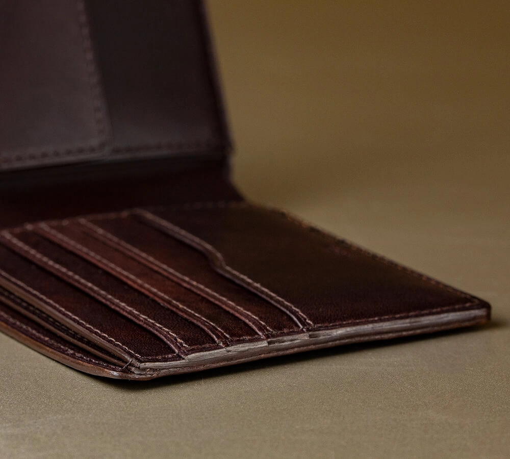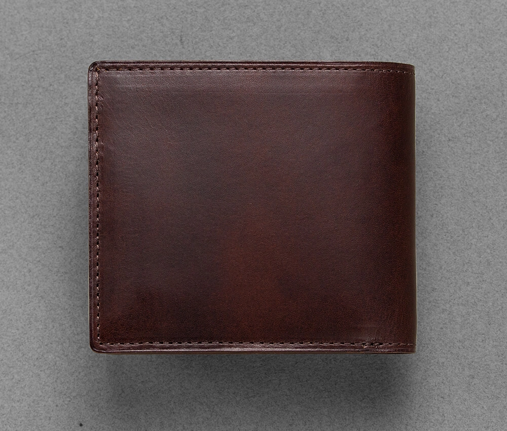 この二つ折り財布のカード段は「ヘリ返し」と呼ばれる処理を施している。「ヘリ返し」とはカード段の上部の革を内側に包み込むように折り返して処理をする方法の事だが、こうすることによってカード段が伸びにくくなる。さらにこのカード段の裏には革が貼り合わせてあり、カード段の耐久性を向上させている。極めつけはヘリ返し部分にしっかりとステッチかけていること。これによってカード段がたわみにくくなっているのだ。カードは出し入れが多く、カード段には常に負荷がかかるためにここまで手間をかけるのだが、この処理を施しているカード段は稀有。他に類をみない手間のかけ方は作り手が辟易するほどだ。