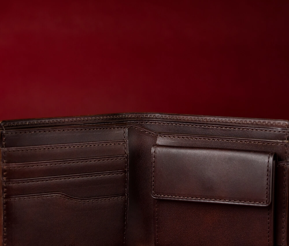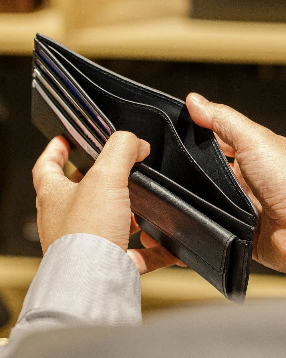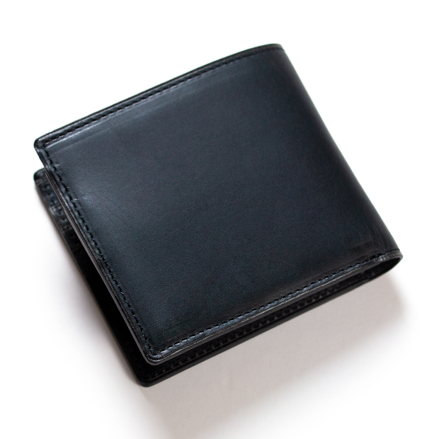 財布を閉じている時、開いている時、いずれもすっきりとシャープな印象になるのは縁に引かれたネン(縁に施されたライン)が理由だ。同じ力且つ同じスピードで引く技術が求められるのだが、革に重なりのある箇所や凹凸のある革などは至極引きにくい。また、よく見るとこの二つ折り財布には内装のいたるところにこのネンが引かれており、非常に手間がかかっていることがわかる。そのおかげで全体がカチッとした印象で統一されていて紳士らしさを演出してくれているのだから、その意味は大きい。
