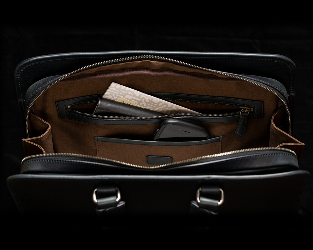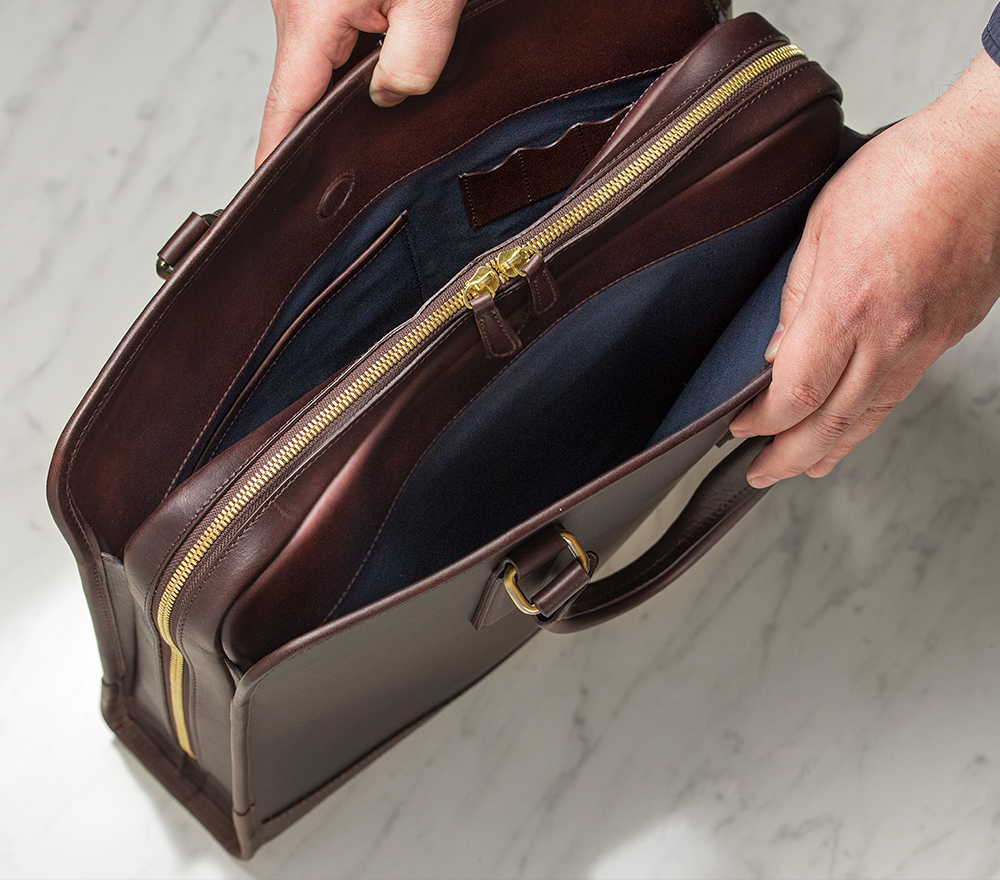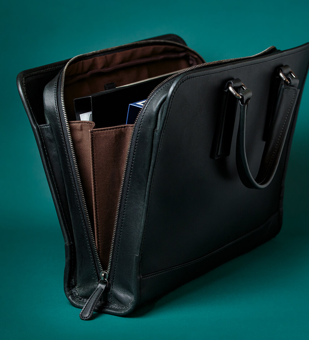 ファスナーは底面まで下ろすことができるので鞄をガバッと開くことができ、中が非常に見渡しやすい。内装の色は汚れを目立たなくさせるため、ダークブラウンには紺を、藍鉄には茶を採用。またファスナーを全開にしても、蛇腹状のマチに高さがあるために中のものが側面から見えることがない。さらにファスナーを開けていても鞄が自立してくれる作りも容量がある鞄としての使い勝手の良さを実感できる部分だろう。