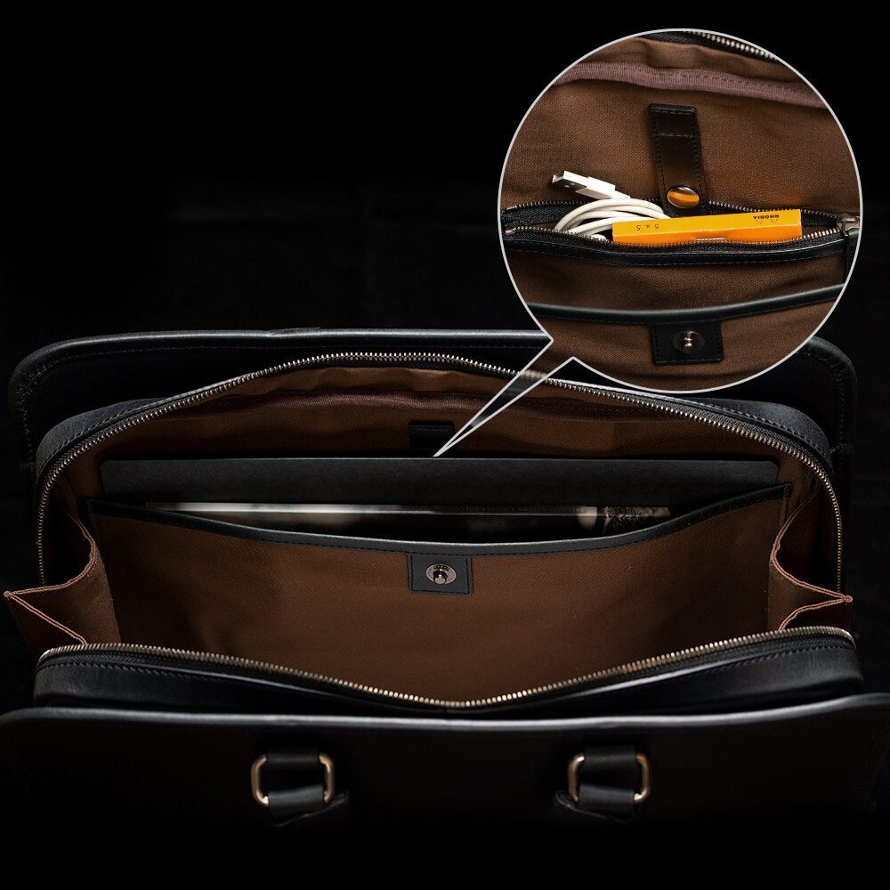 このブリーフケースには2つのアオリポケットが備わっている。これが実に機能的だ。留め具に隠しマグネット(革でマグネットを覆う)方式を採用しているため、スッキリとした見た目で、物を出し入れする際に留め具にひっかかることもない。また、ファスナーを開けることなく出し入れができるので、タブレットや雑誌、スマートフォンなど出し入れの頻度が高いものを入れておくと非常に便利。さらに背胴側のアオリポケット内部にはペン挿しとフリーポケットも搭載。このアオリポケットを使えば、外ではほとんど鞄を開けることなくスムーズに物の出し入れができるはずだ。