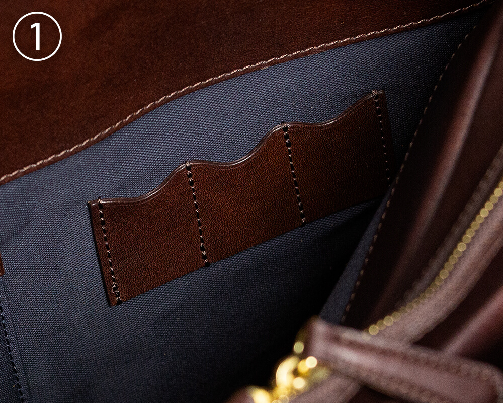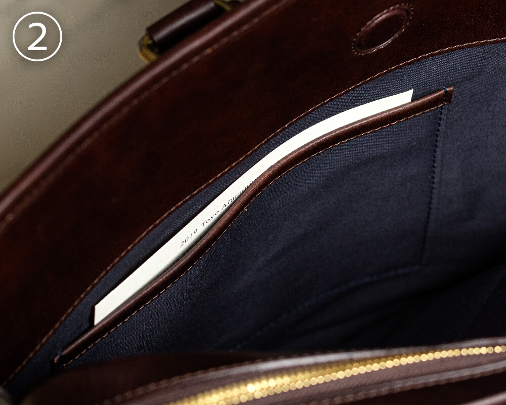 このブリーフケースには2つのアオリポケットが備わっている。これが実に機能的だ。留め具に隠しマグネット(革でマグネットを覆う)方式を採用しているため、スッキリとした見た目で、物を出し入れする際に留め具にひっかかることもない。また、ファスナーを開けることなく出し入れができるので、タブレットや雑誌、スマートフォンなど出し入れの頻度が高いものを入れておくと非常に便利。さらに背胴側のアオリポケット内部にはペン挿し(①)とフリーポケット(②)も搭載。このアオリポケットを使えば、外ではほとんど鞄を開けることなくスムーズに物の出し入れができるはずだ。