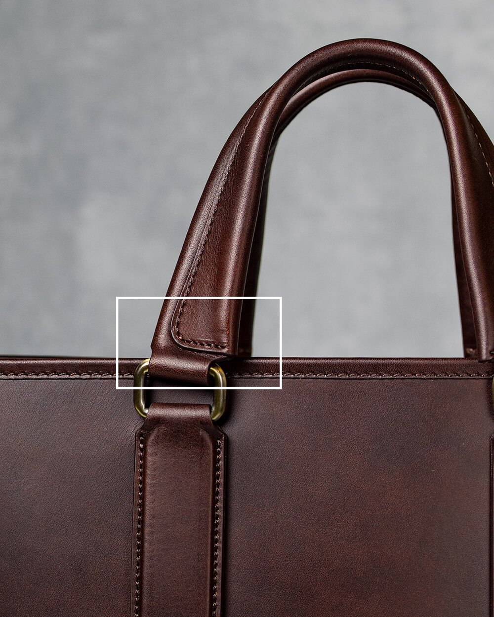 底面には重厚感が漂う真鍮削り出しの金具を使用。鞄を直接、地面に置くよりも革の傷みは和らぐのは勿論のこと、鞄を地面に置いた時の「カツッ」と鳴る音が心地よく、高級感が漂う。普段使っている際には見えない部分だが、あるのとないのとでは大きな差が出る箇所。そこに真鍮削り出しの挽物を使っていることはちょっとした自信に繋がるだろう。