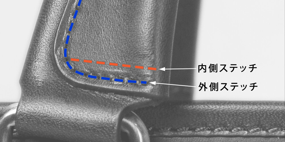 ハンドルは形と同時に荷物の重みに耐えられる強度と耐久性も求められる。Alt81はハンドルと接続する金具の角カン部分に強度が増すよう内側と外側の両方からステッチを施した。作業の手間は増えるが重みの負荷がかかりやすい箇所だからこそあらかじめ入れた工夫である。また、ハンドルには伸び止めを入れ革の伸びを防ぎ、さらに根革(ハンドルを鞄の本体に取り付ける革部分)にも伸び止めを入れるひと手間を加え補強している。