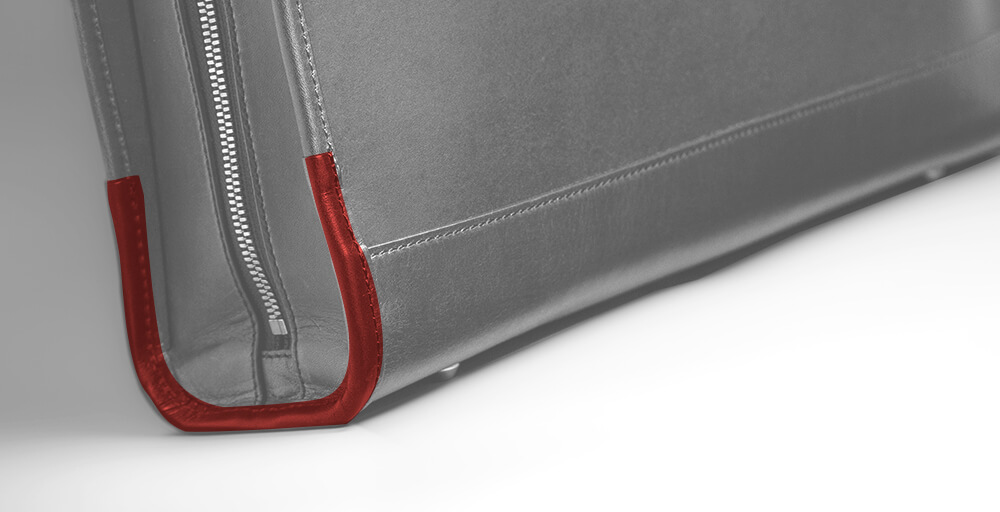使い続けるとどうしても傷みやすい箇所が出てくる。Alt81は安心して長く使えるようにあらかじめ使用中に起こりうる事例を考慮し、念入りな補強を施している。例えば下マチ部分。物や人にぶつかって傷みやすいこの箇所はヘリ巻き(革で包みこむ)で補強し、万が一、革が擦り減ったり削れた場合には革のパーツを交換出来る仕様にした(※下図・赤)。同様に底も万が一傷んでしまったことを考え、全面換装ではなく、部分換装が可能な設計にしている。鞄の側面というのは正面で向き合った時に意外と相手に見られている箇所。カチッとした印象を与えるtrack_ブリーフケース03だからこそ一層意識して設計と作りに工夫を重ねた点だ。