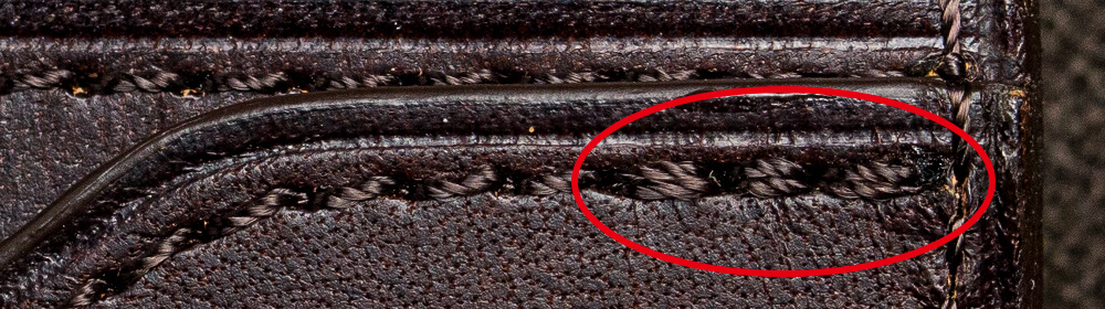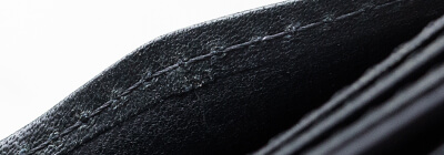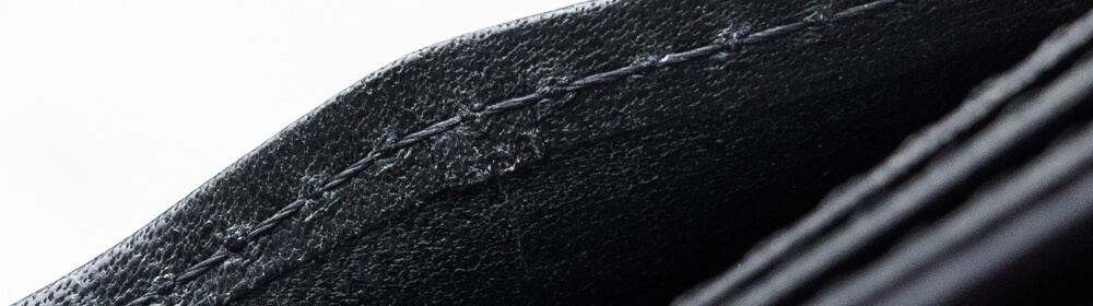 財布を閉じている時、開いている時、いずれもすっきりとシャープな印象になるのは縁に引かれたネン(縁に施されたライン)が理由だ。同じ力且つ同じスピードで引く技術が求められるのだが、革に重なりのある箇所や凹凸のある革などは至極引きにくい。また、よく見るとこの純札入れには内装のいたるところにこのネンが引かれており、非常に手間がかかっていることがわかる。そのおかげで全体がカチッとした印象で統一されていて紳士らしさを演出してくれているのだから、その意味は大きい。