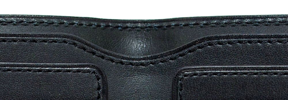 カード段は3段あり、左右両方に配置され計6枚のカードが収納可能。このカード段の縁は「ヘリ返し」と呼ばれる手法によって革が内側に折り込まれ、さらにその上から伸びや切れを防止するためのステッチがかけられているのも実にAlt81の十八番だ。また、このカード段は横幅が少し長く感じるかもしれないが、実はこの幅にも意味がある。前述の自由領域の厚みが増した際、カードが曲がったり、衝撃で折れたりしないようにゆとりを持たせているのだ。しかも、ゆとりを持たせたからといって、革でカード段が形成されているので、緩くなることはない。極めて合理的な作りと言える。