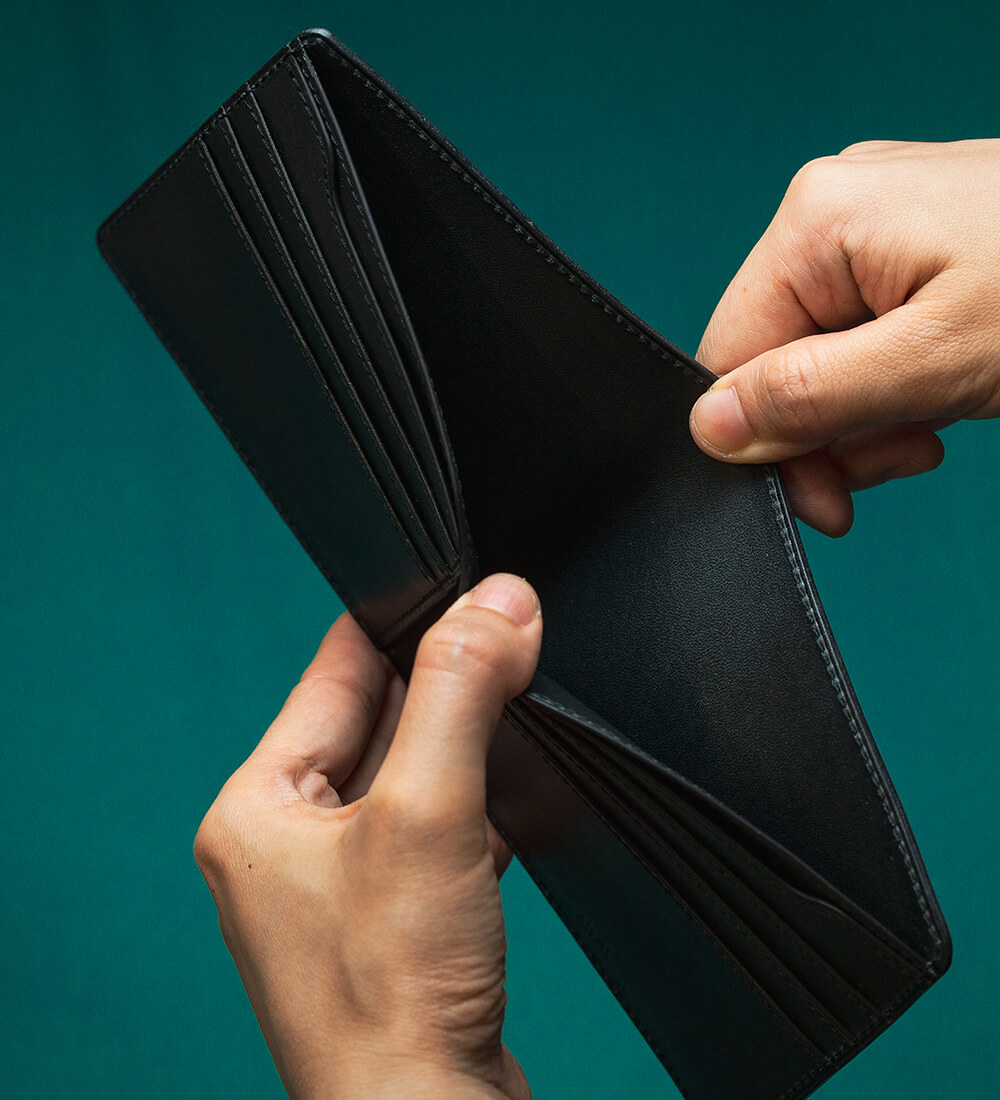純札入れを知らない方には小銭入れのない二つ折り財布が少し珍しく映るかもしれないが、慣れてしまうとこの形が如何に合理的かがわかる。なぜなら左右対称に作られた形にカードや紙幣を入れていくと均等に厚みが増し、歪みが生じないからだ。きわめてシンプルに使えば厚みは28mm前後になり、スーツの内ポケットにも簡単に収まり、違和感がない。電子マネーの流通で貨幣を使わなくなったと言われて久しいが、この純札入れは流行り廃りの波を意に介さない、強靭な意思を感じる。