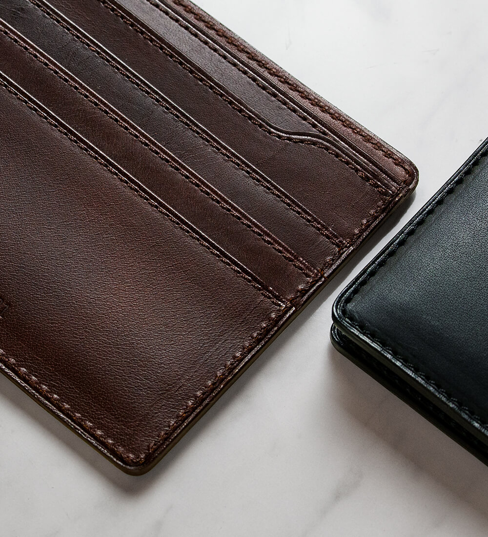 この純札入れに使用している素材はビートルと呼ばれる硬質な革。オイルがしっかりと含まれており、触るとツルッとした質感がある。色は赤味の強いダークブラウンと、Alt81のブランドカラーでもある藍鉄の2色。ダークブラウンはその色名と少し違った印象を持つかもしれないが、濃淡もあり色気が漂う。藍鉄は黒よりも青く、少し緑味のある色でシックな印象を受ける。真逆な2色に悩みは尽きない。