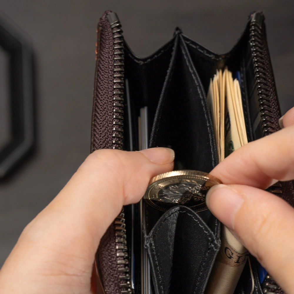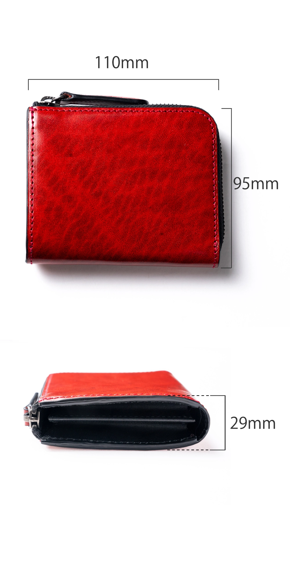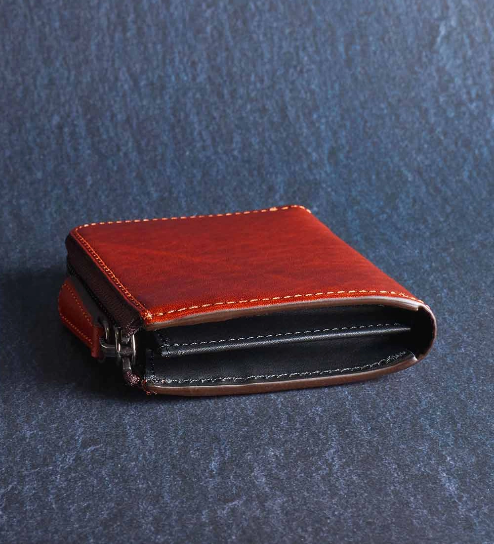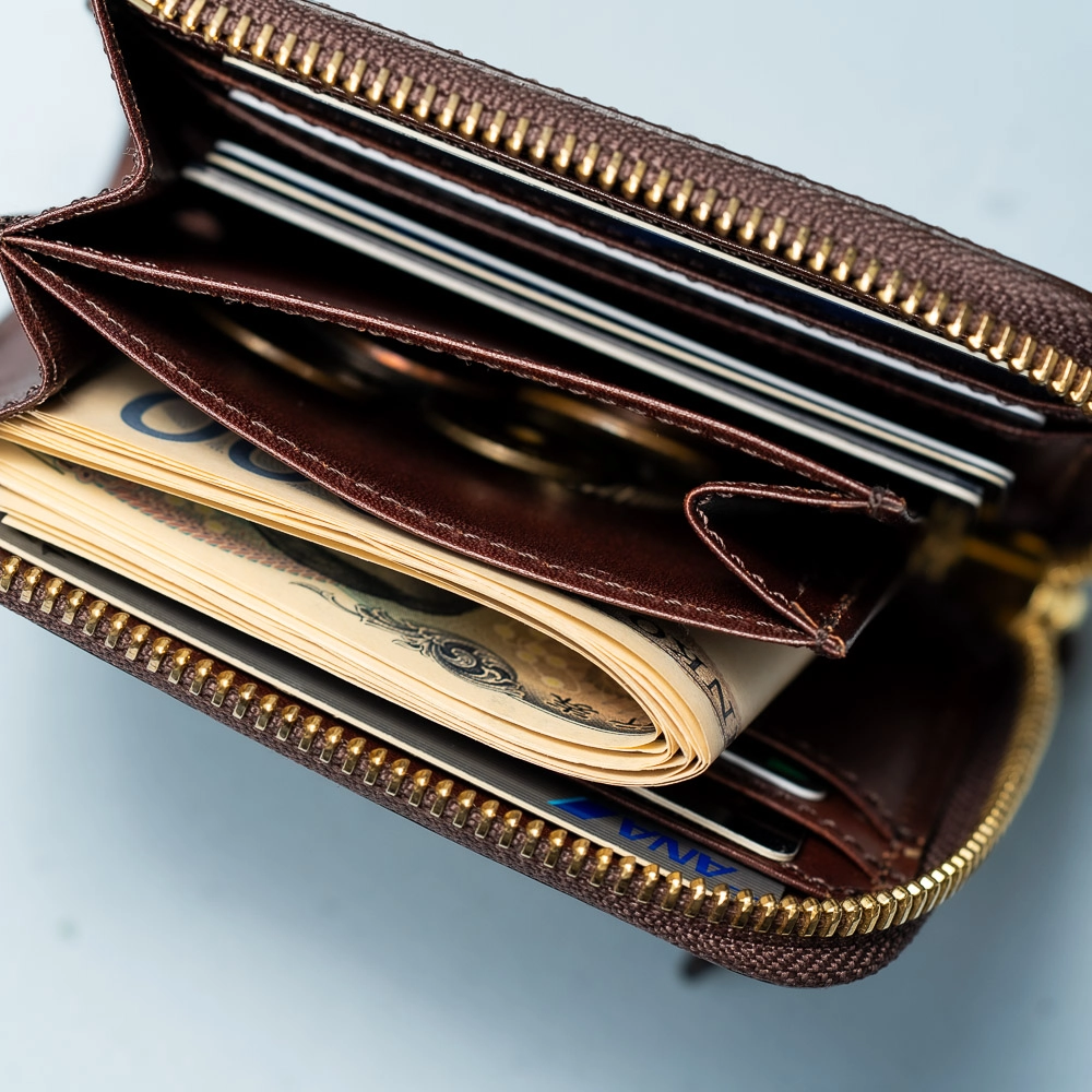 前述した小銭入れのマチについて解説を少し。ファスナーを開けると中央で間仕切りの役割を担っているのが小銭入れ用のポケットだ。このマチは大きく取れば取るほど、内側への折り込みが大きくなってしまうので幅は約3cmとした。小銭入れの内装にもしっかりと革が貼られていて硬貨の擦れなどにも強い。また、指を入れた際にもツルツルとしていて肌を傷める心配もない。さらにマチをつけた理由がもう1つ。この小銭入れを挟み込むように紙幣を収納すると、ファスナーの開閉時に紙幣を傷める可能性があるため、マチを挟んでの使い方をしづらくさせたのだ。