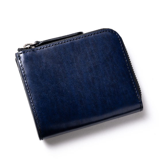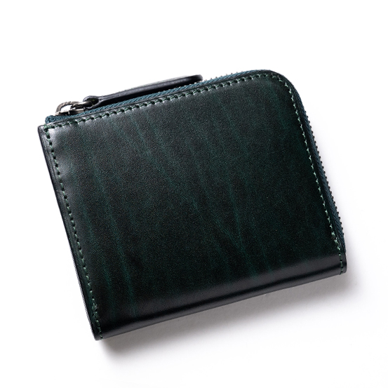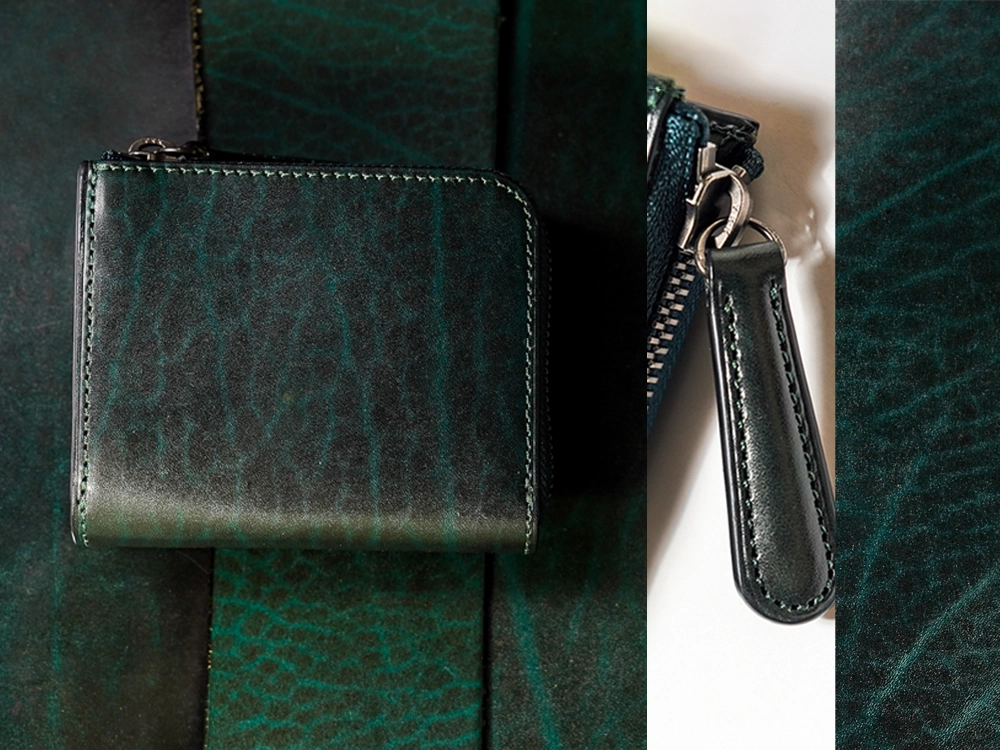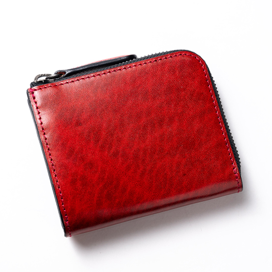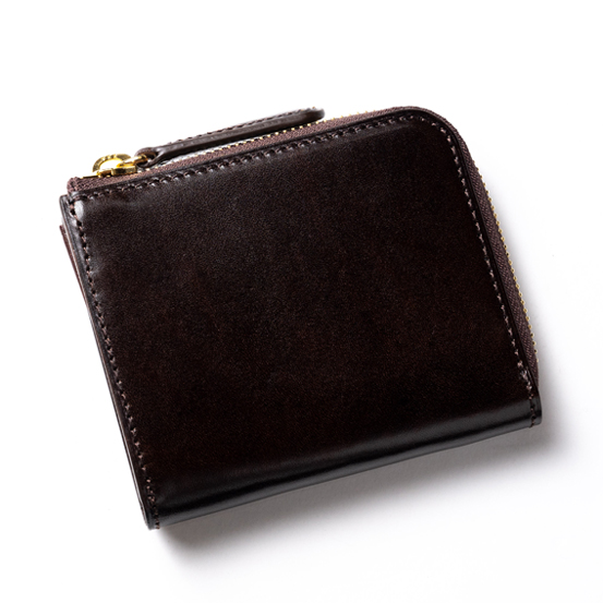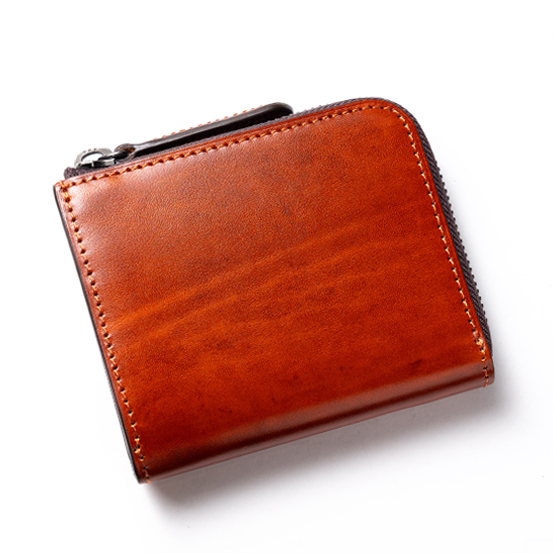 外装に使われているルガトショルダーに厚みを持たせて内装も全て別の硬質な革で作っているため、使用している革の分量が多く、このサイズにしては重量を感じる。そのかわりに硬い革特有のハリが高級感となって商品を包み込み、この形の財布に漂いがちなカジュアル感は皆無だ。使い込むことで次第に柔らかくなる革の特性もしっかりと持ち合わせているので、その変化をじっくりと愉しんでいただきたい。