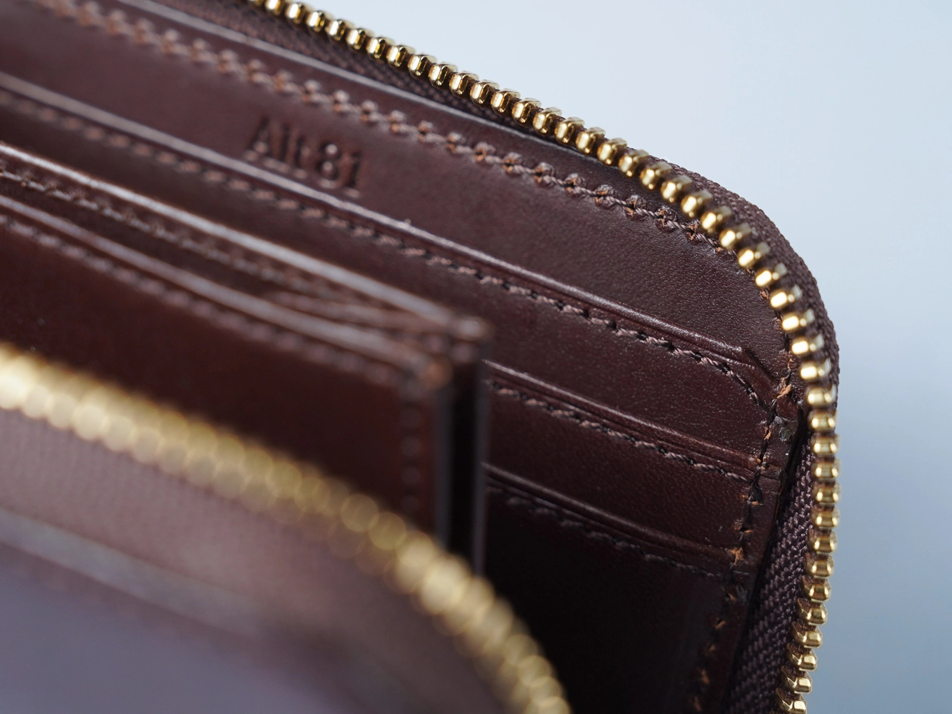 カード段はAlt81の十八番となっている、へり返し+ステッチの仕様。これはカード段の耐久性を高め、革の伸びを防止させたり撓みを軽減させる作用がある。最初は硬く感じると思うが、慣れればしっかりとしたカード段に安心感を覚えてもらえるはずだ。