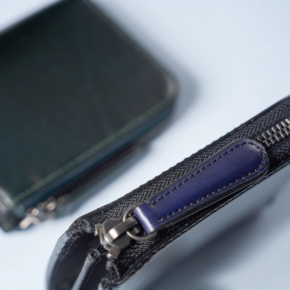 メッキのされたファスナー本体とそれを繋ぐファスナーテープと呼ばれる生地部分はそれぞれ、ルガトショルダーの革色に合わせており、高級感のある金属の質感と、派手すぎない配色がこの商品をより輝かせてくれる。小さい商品ながらもファスナーにはYKK社のエクセラファスナーを、サイズは少し大きめの5番を採用し、頼り甲斐のある見た目と品質はこの申し分ない。