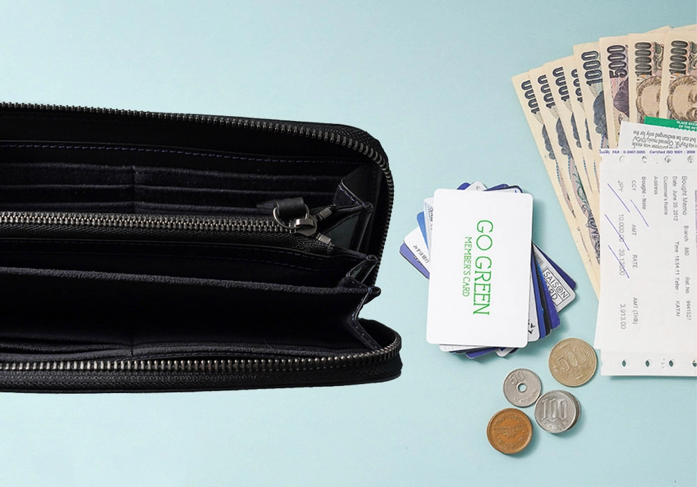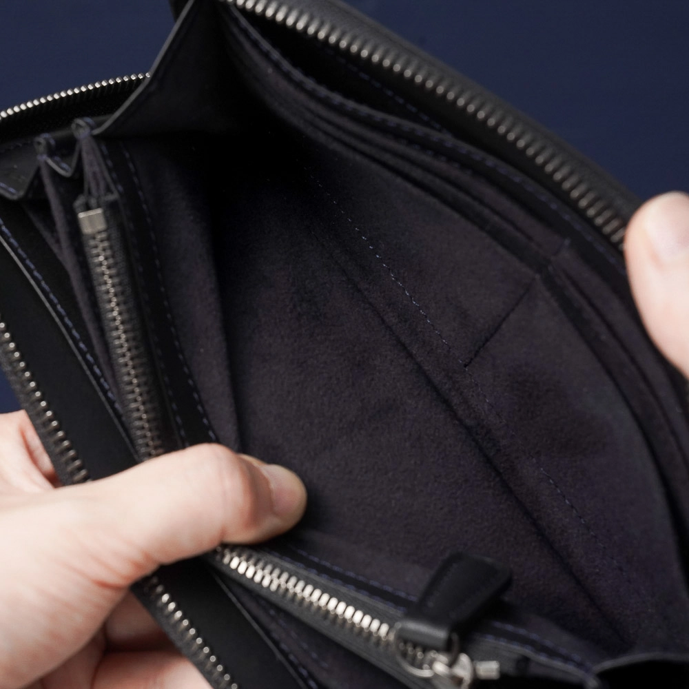 ラウンド長財布の魅力はなんといってもその収納力だろう。用意されているカード収納段は12段、紙幣を入れられるポケットは3カ所もある。さらにカード段の裏にはベタマチ作りのポケットが2カ所あり、用途の説明に困るほど。人によって財布に収めたいものは領収書や御守り、銀行の通帳やパスポートなど多種多様。収納力のあるこのラウンド長財布を鞄に入れておくと、あたかもバックインバックのような存在感があるのはそのためだ。