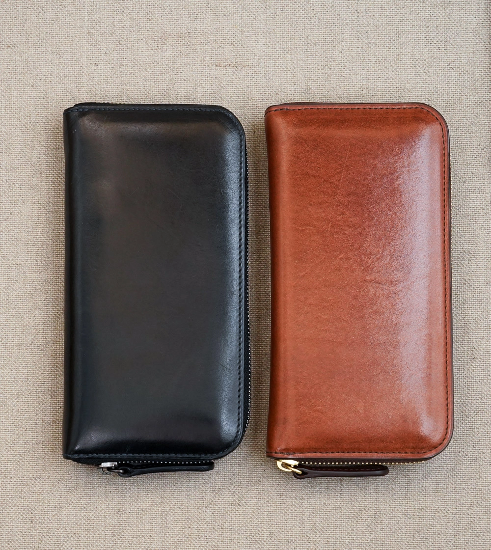 ラウンド長財布の説明に入る前に色の案内をさせていただきたい。今回、ご用意した色は「ブラック」と店舗限定での取り扱いとなる「ブラウン」の2色。使用前のブラックは灰色に近い色味で、ところどころ白みがかかり灰色に見える。これは革に含まれているオイルが表面に現れているためで、ブラウンも同様に少し白さがある。革の表面にある表情は通常であれば仕上げ加工で隠れてしまう模様も、はっきりと見える。「ブラウン」が店舗限定になっている理由も、あまりにもその表情に個性があるためだ。では、この色がその後も続いていくかというとそうではない。約半年もすると、色は大きく変化する。