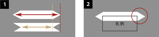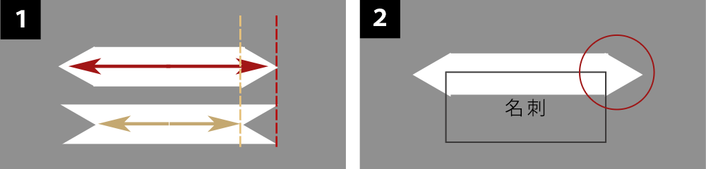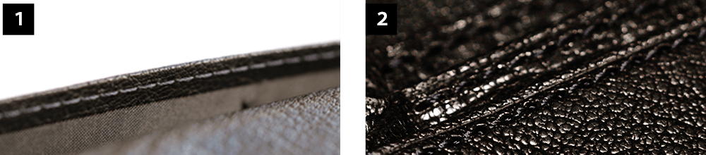 この名刺入れのカード段には一目見ただけではわからない丁寧な手作業が組み込まれている。まずカード段の強度をあげるために、出し入れする頻度が高いカードポケットには全て「へり返し」(※図①)を施し、さらにその上からまっすぐステッチをかけている。使っていくうちに起こる革の伸びや切れなどの防止するために加えたこのひと手間は長く使い続けるための工夫である。またカード段にもくっきりとネン引きを施した(※図②)。同じ力かつ同じスピードで引く技術が必要なこの作業は凹凸のある革では極めて難しいが、この直線ラインがあるのとないのでは実際、手にした時の見た目のシャープさが全く違う。