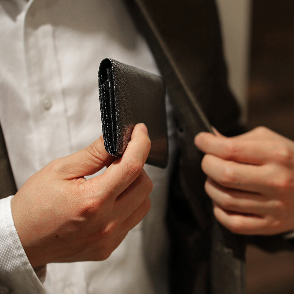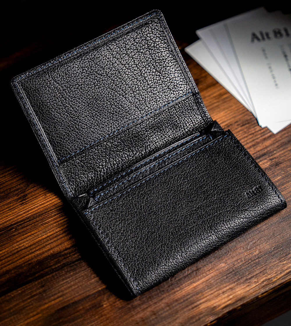 名刺入れに使われる革は比較的、硬い革が多い。その理由にパリッとした雰囲気を出したい、柔らかい革だと長く使っているとへたってしまうというものがある。だが、この名刺入れに採用されている「P&Dバッファローカーフ」にはしっかりとしたコシがあり、硬すぎず柔らかすぎない特徴がある。革の持つ雰囲気からも硬質な印象を与えることも可能だ。この特有の質感は持った人だけがわかるささやかな楽しみだと言える。