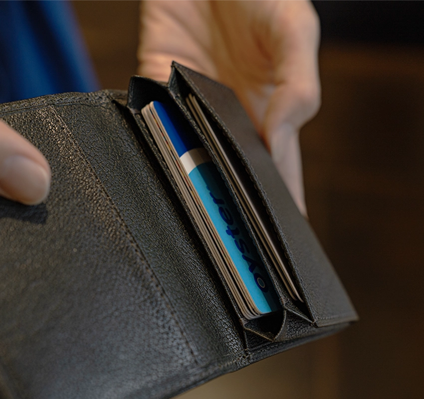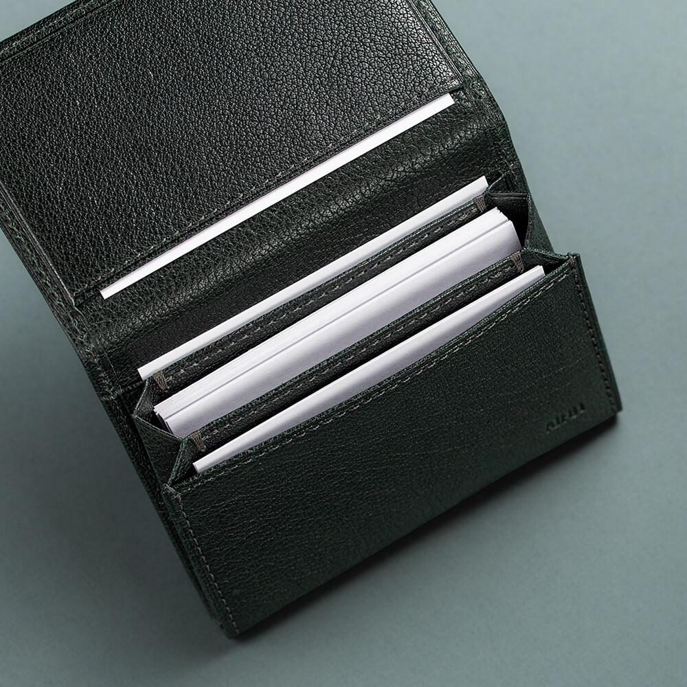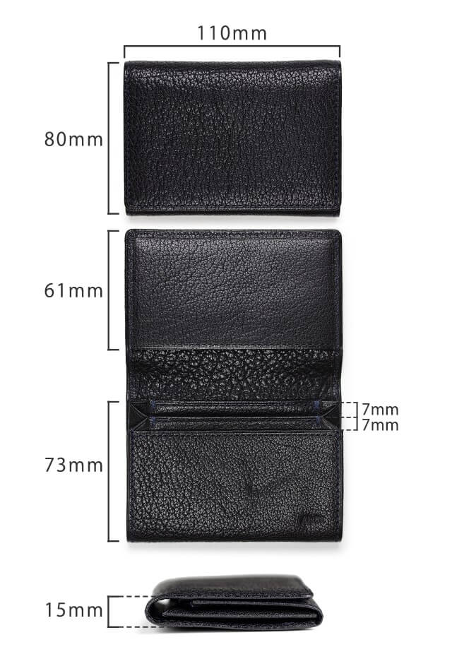 風琴(アコーディオン)マチと呼ばれるくらいなので中身の有無によって、見た目が大きく異なる。一般的に名刺入れというのは中身が常に増減するが、名刺が入っていない状態では中央が凹んでしまう。これはマチが内側に織り込まれているため、そこの部分だけ他よりも厚みが出てしまうからだ。風琴マチの場合は外側にマチが出る構造のため、基本的に名刺の枚数に応じて高さが上下するだけだ。長く綺麗な状態を保つ秘訣は、この構造が理由なのかもしれない。