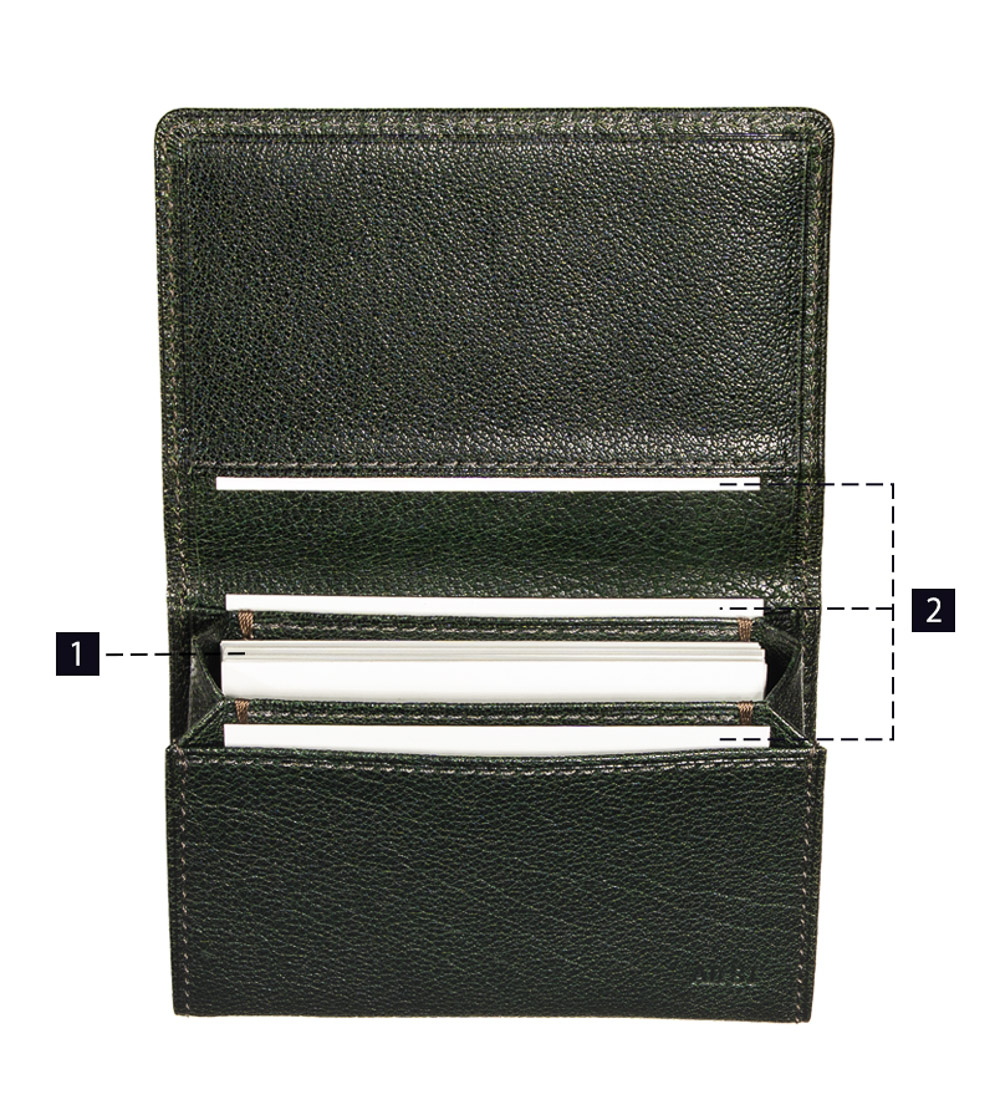 メインポケットには約30枚の名刺が収納可能(※図①)。また、それ以外にベタポケットを3つも装備(※図②)。このベタポケットは収納力があるわけではないが3つもあるので、いただいた名刺を目的に応じて分けて収納したりすることができる。実は風琴マチの構造上、この作りを採用すると自然とポケットが多くなるのだが、作りが完成されているため、ポケットの多さに対して薄さが実現できている。