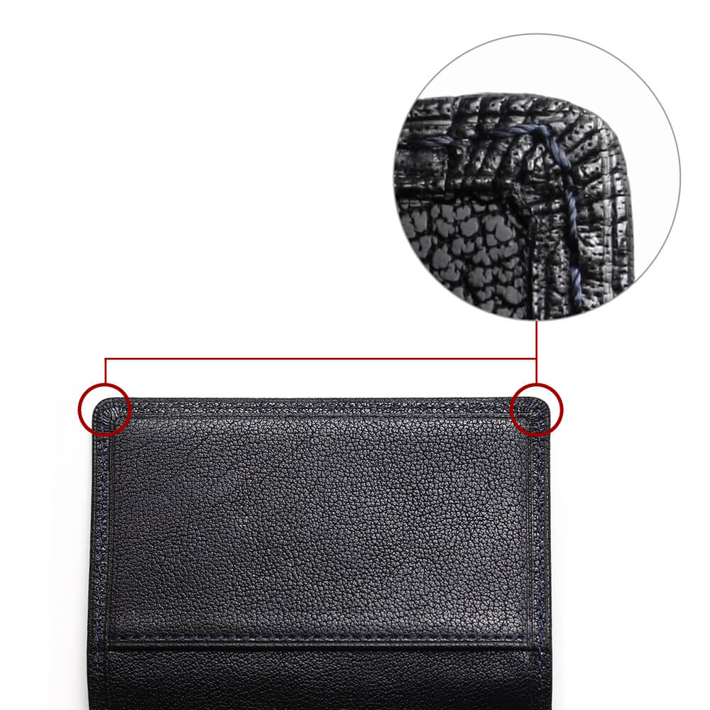 職人泣かせと言われているのが縁の処理だ。この名刺入れの縁の処理はヘリ返し(表の革を巻き込む方法)が採用されているのだが、ステッチをかけたヘリ返しの上に3本の線が引かれているが見えるだろうか。これはネンと言って商品全体の印象をグッと引き締め、立体的に見せる技法なのだが、通常は1本を見た目を引き締めるために施す。だが、この名刺入れにはその他に2本引かれており、非常に糊付のしずらいこの革をしっかりと抑え込むという役割を担っている。