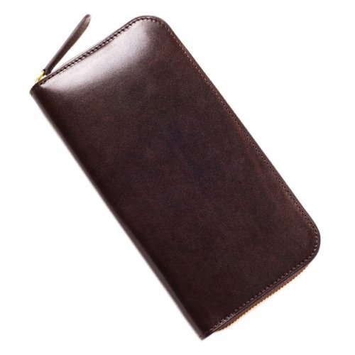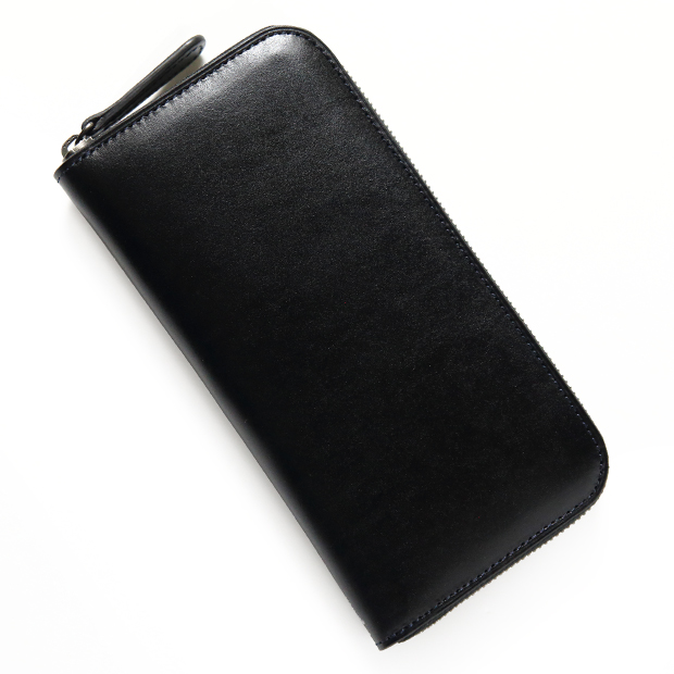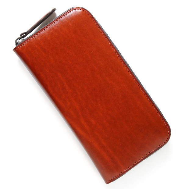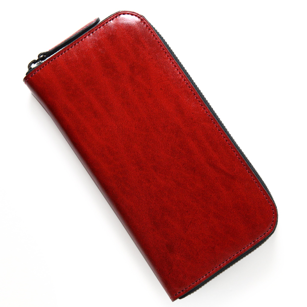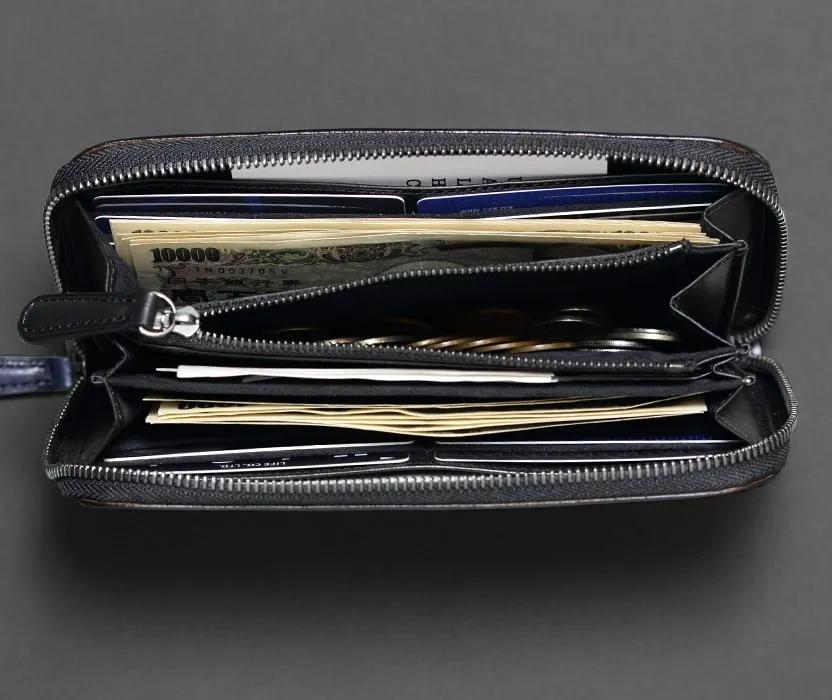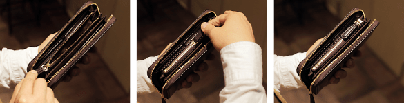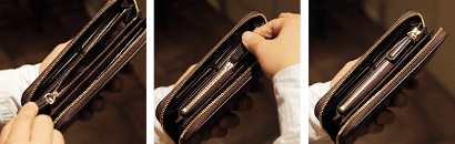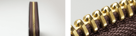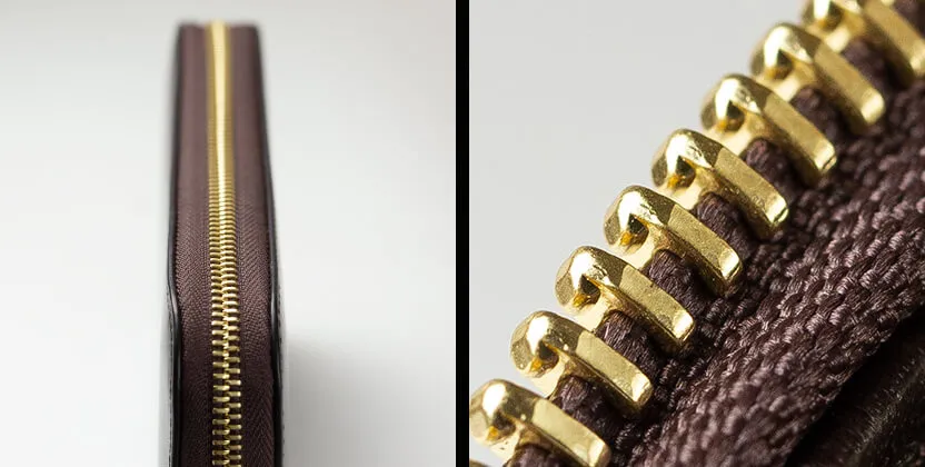 ファスナーは力のかかりやすい曲線部分のカーブを緩くし、壊れにくさを追求。ファスナーテープの縫い方にも細心の注意を払い、たわみのないカーブ、歪みのないストレートラインに仕上げた。またファスナーは通常より大きなのものを使用。一般的なラウンド長財布に使用されているファスナーよりも耐久性はあるがやや滑りが硬くなるという難点を、務歯(ファスナーの噛み合わせる部分)を磨きあげた高級なエクセラファスナーにすることで解決し、滑りをよくしている。