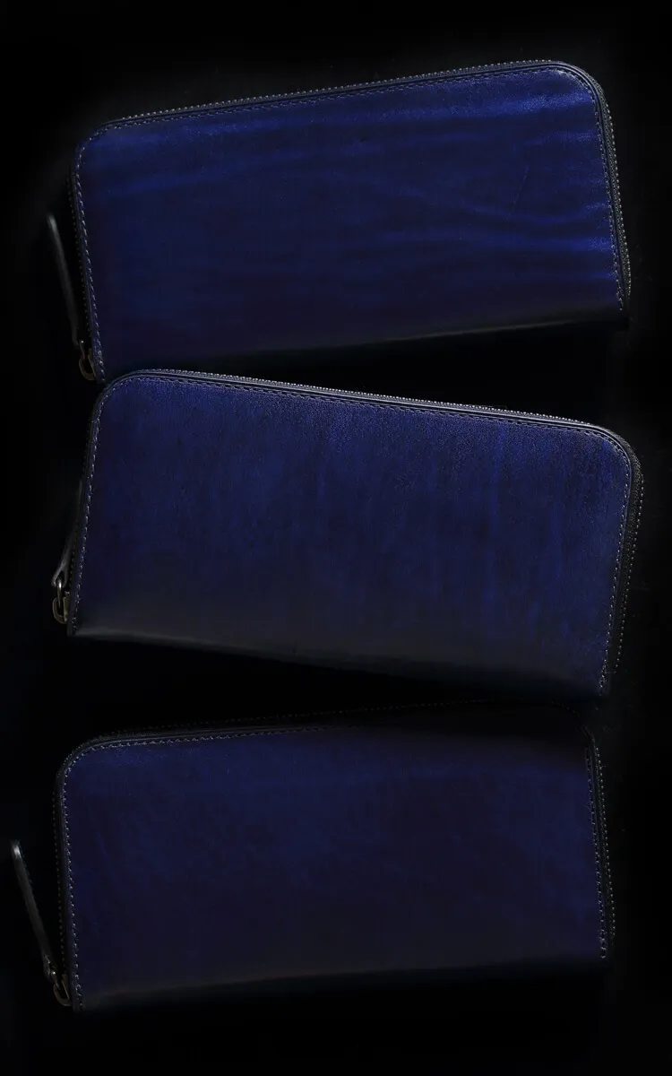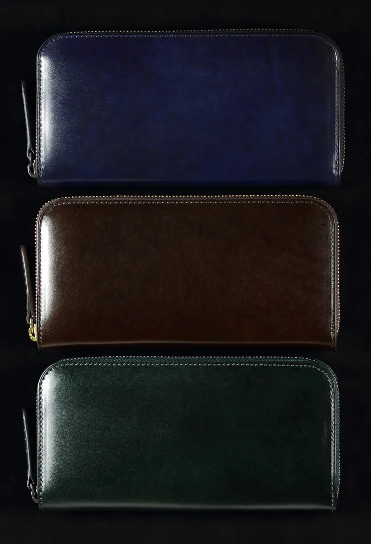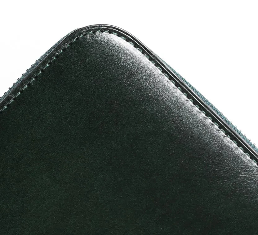硬くパンッとした張りのあるこの革は使用する面の大きな長財布でこそ、その魅力が最大限発揮される。その名も「ルガトショルダー」。表面に光沢を宿し、その奥にショルダー特有の模様が美しく映える。力強さが滲むグリーンに、上品さを漂わせるダークブラウン、色気を感じさせるネイビー。光の入射角度によって色味や表情が変わるこの革は「革の宝石」と呼ぶに相応しい。