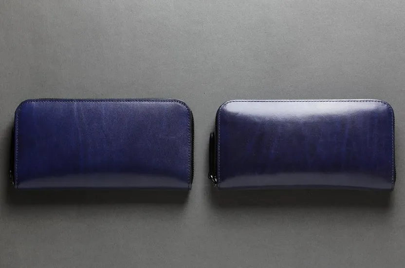 この長財布は持ち主の使い方を鏡のように映す。例えば荒っぽく使うと傷は増し、本来の牛革の肩の部位が持つ力強さを覗かせる。逆に大人しく使っていると変化の度合いは少なく、美しさを保つ。革に乗せた水性の光沢剤は次第に落ち着き、手の油分や水分を吸収することで人によって異なる表情を醸し出す。その様子に持ち主は心を惹かれ続けるだろう。