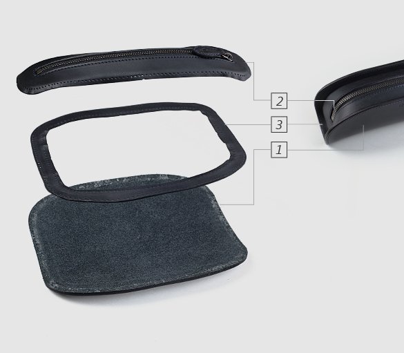 目指したのは、印象を残す目を引く形。Alt81はペンケースに立体感を持たせることで力強い迫力を表現しようと考えた。「ステマチ」という鞄の作りを堅牢なシールドショルダーレザーを使い作ることにしたのはそのためだ。ステマチという作りはペンケースにはあまり使われないが表版に一枚革をたっぷりと使うことが出来る。その一枚革でファスナーが取り付けられた天マチ(ファスナーを取り付けた上面部)をぐるっと挟み込むようにすると高さのあるマチ「ステマチ」が出来、強いインパクトを生む。ハデさはないがこの立体感にはこだわりが詰まっている。