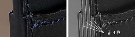 そんな革の厚みを美しく引き立てているのがコバ(断面)だ。4枚もの革を貼り合わせている箇所は革を重ねていることが分からないほど丁寧にコバ処理を施している。四隅の角は出し入れする際当たったり引っかかったりして傷みやすいことを考え丸みを持たせた設計にしているが、この絶妙な丸みを帯びた角に美しく施されたコバがより一層迫力とすっきりとしたシャープな印象を加えている。このような分厚いコバはあまり見かけることがなく珍しいため、個性が宿る。