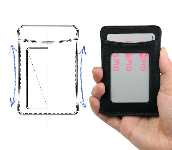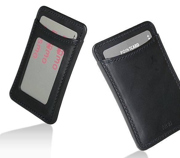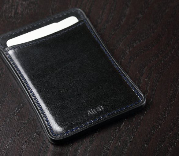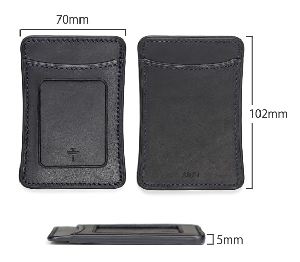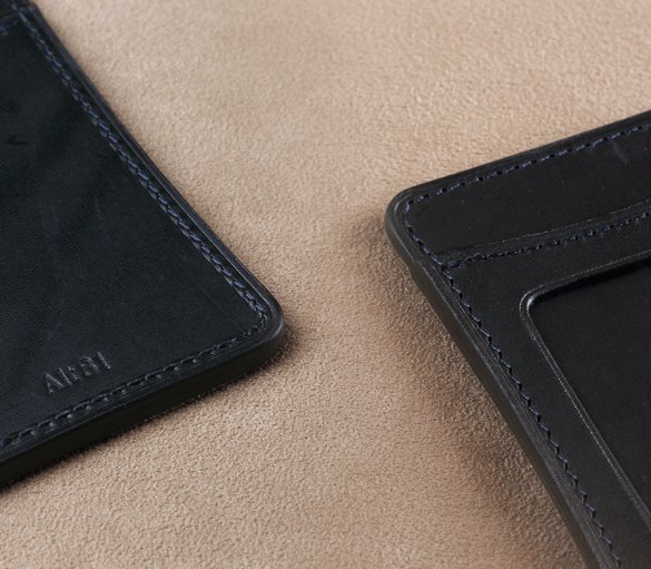 チャージ機能のついたICカードはもはや金銭。だから収納するパスケースにはICカード単体で手軽に持ち運べ、且つスーツの内ポケットにもサッと入れられる余計なパーツを省いたスマートな形を目指した。勿論、シンプルな中にも要所にAlt81らしい独自のこだわりがある。正面から見ると両サイドに約1.5㎜ほど緩やかなテーパーをかけている。これはデザインのアクセントでもあるが、ぐっと握った時手に馴染みやすい形を考慮した設計。使い始めはカードの出し入れに若干硬さを感じるだろうが、大切なICカードが落ちてしまわぬようこのぐらいの硬さが必要だが使用していけばオイルを含んだ革が徐々にカードに馴染み、取り出しやすくもなるのでご安心を。