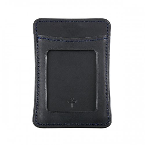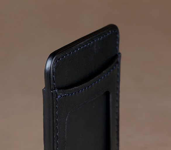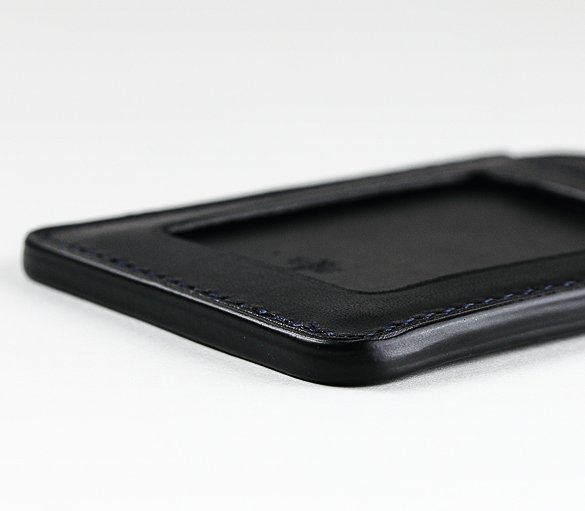 このパスケースに使用されている革はシールドショルダーレザー。繊維密度が高く、強靭で分厚いこの革を採用することで存在感のあるパスケースが生まれた。折れ曲がることが許されない定期券だからこそ、この革の厚みが確かに適している。またこの革はオイルをたっぷりと含んでいるため、使い込むことで手の中で白みがかった黒色が次第に漆黒へと変化していく。そして毎日使うことで刻み込まれる傷や革色が濃くなるほど効いてくる青色のステッチも使うほどに増す味わいの1つとなっていく。