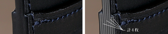 mark_パスケース_01の特徴は何と言っても5㎜の厚み。繊維密度が高いシールドショルダーレザーを窓枠の付いたメインポケットと裏面のカードポケットにそれぞれ1枚ずつ、中央は2枚貼り合わせているため計4枚の革で出来ており、その存在感は抜群だ。5㎜という厚みを美しく縫製する技術は非常に難しい。とくに手を焼くのが両面二カ所のカードポケットを縫い合わせる箇所。全体の縁のステッチはぐるっと一気にミシンを掛けるのだが、パスケース上部の両面ポケット2枚の革が加わる箇所で約2㎜ほどの段差が出来るため縫製しづらい。熟練職人の細やかな手練により、美しく均一に仕上がっていることがお分かりだろう。