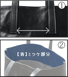 柔らかい革質のP&Dバッファローカーフの大判をこの大きさの鞄で使用するなると、現れやすいのが胴版のシワ。特に重い荷物を入れると根革の部分にハの字のシワが出やすい。このシワを軽減させるために、根革間の距離を力が分散する幅に設計し(※図1)、ミツケ(内装の口元部分)は贅沢に2枚の革(胴版とミツケ)と根革を直接縫製(※図2)。さらにミツケの高さは通常の倍ほど深くした(※図3)。1枚の革だけに根革を縫製すれば、その負荷から当然シワになりやすく、またミツケの高さが浅くてもシワが寄りやすい。シワは見映えに影響する上、上部に力がかかりステッチの傷みにも繋がり兼ねないからこそこだわった点だ。