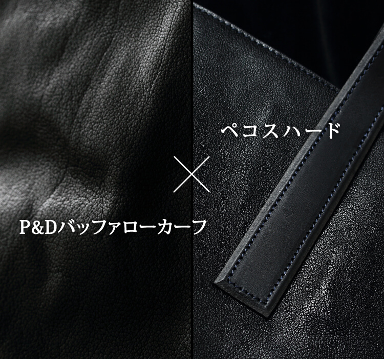 この鞄には2種類の革が使われている。まず、浮き出るシボやギラっとした見た目が印象的なP&Dバッファローカーフ。持ち味である「独特のコシ」を極限まで愉しんでもらうため、また革の表情を存分に味わってもらうために大判を使用。そしてハンドルなどに使用されているもう1つの革、ペコスハード。この革の硬さによって立体的な迫力を生み出した。存在感だけで人の印象に残るトートバッグは必ず仕事の武器となるだろう。
