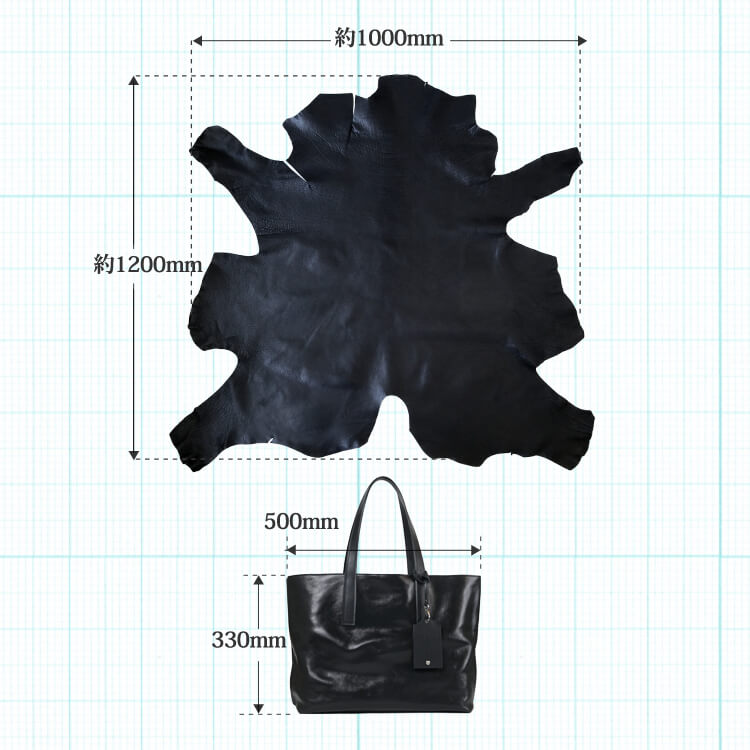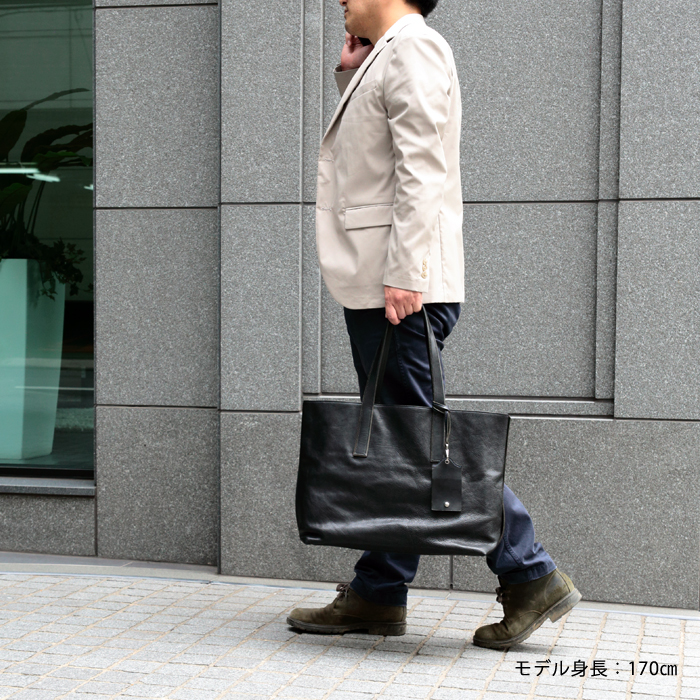荒々しく無骨な雰囲気を漂わせるP&Dバッファローカーフを大判で見せることで、革の迫力を存分に愉しんでもらえるトートバッグを実現させた。じつは500㎜×330㎜という大判を一枚革から作るというのは非常に貴重なこと。世の中でこの使い方をあまり見かけないのも頷ける。