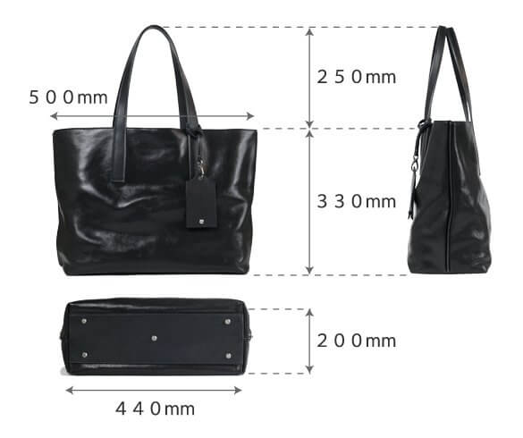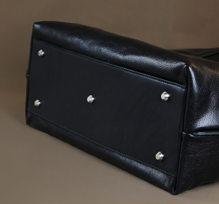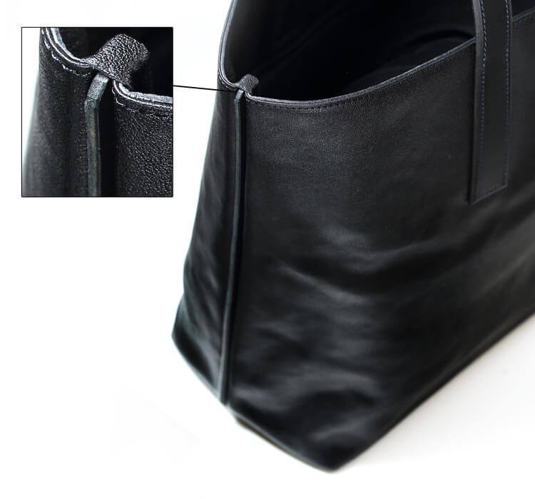 トートバッグの底革には、厚いシールドショルダーレザーを使用。荷物を入れた時もたるまない安定感と、擦れてしまっても厚みがあるため破れることがないことが心強い。