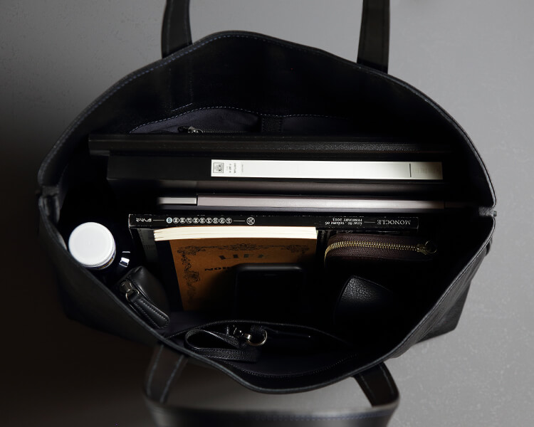 ビジネスに必要なものであれば全て収納できる程の圧倒的な容量をもっている。例えばノートパソコンなら14インチでも悠々と入るサイズ。一泊二日の出張にも軽々と対応できるこの鞄は、逆に入れ過ぎてしまう心配をした方が良いかもしれない。