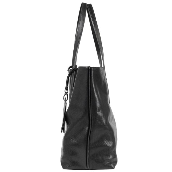 P&Dバッファローカーフはコシはあるが柔らく、大判で使用すると少し頼りない印象を与えてしまう。そこでこのトートバッグの横マチには繊維密度の高いペコスハードを元厚のまま使い、胴版(外装)を支える設計にした。両サイドにあるこの2本の分厚い革のラインは鞄の支柱となり、見た目にもキリッとしたシャープさを加えている。この2本の支柱により胴版に使われているP&Dバッファローカーフがパリッと見え、独特のコシも存分に味わうことができるのだ。