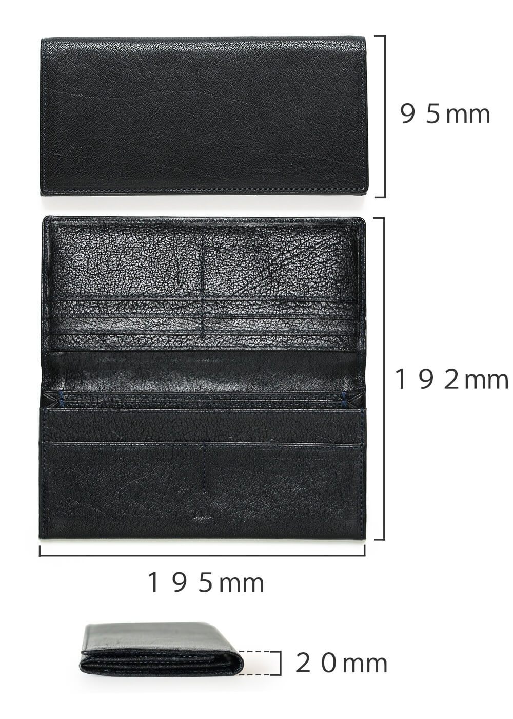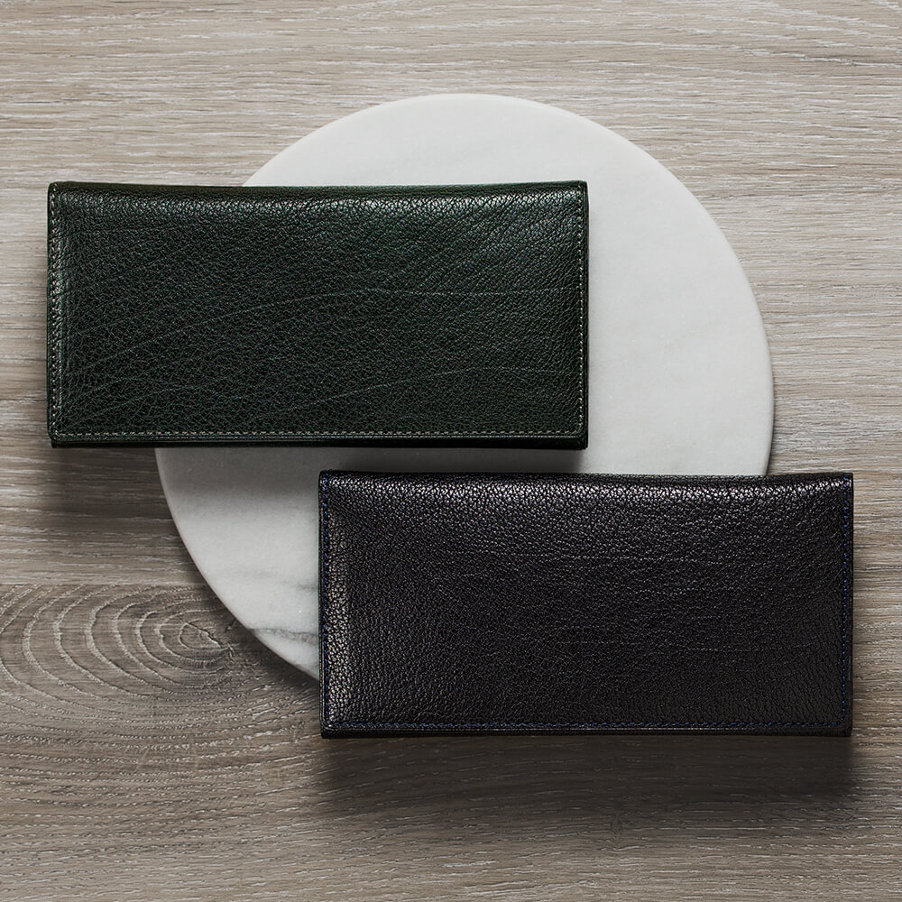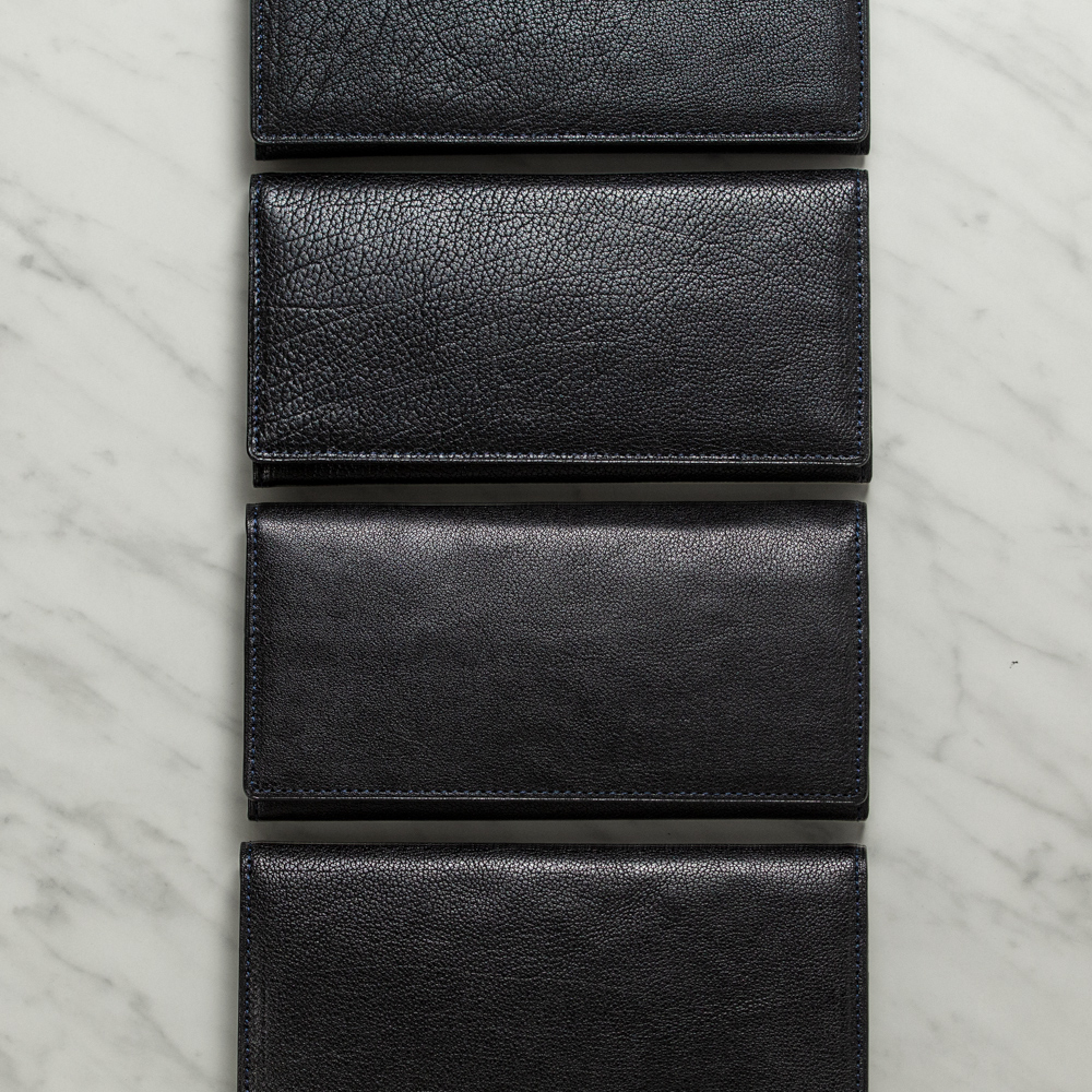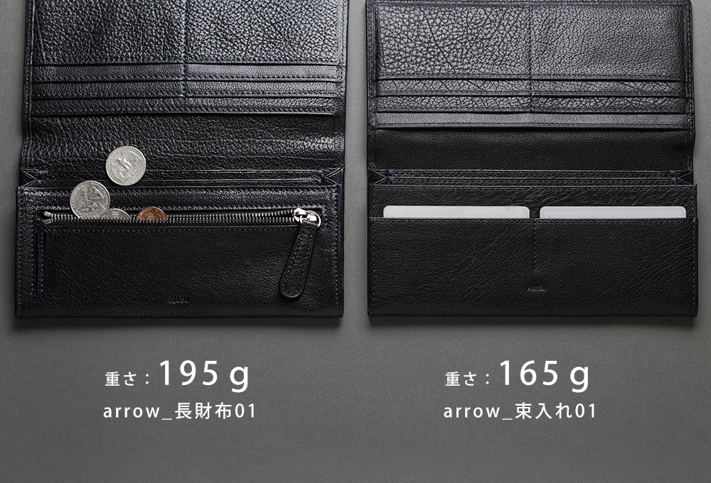 arrow_長財布01(左)をご覧になったお客様からいただいた「小銭入れは持っているから、束入れが欲しい」という要望がベースとなり実現した商品がこのarrow_束入れ01(右)だ。比較すると縦は約5mmほど短くなり、小銭入れの金具やファスナー、引き手を無くすことで重さは約15%軽くなった。小銭入れがあった箇所にはカード段を配し、抜け目もない。小銭入れを既にお使いの方ならば間違いなく眉唾ものの逸品になるはずだ。